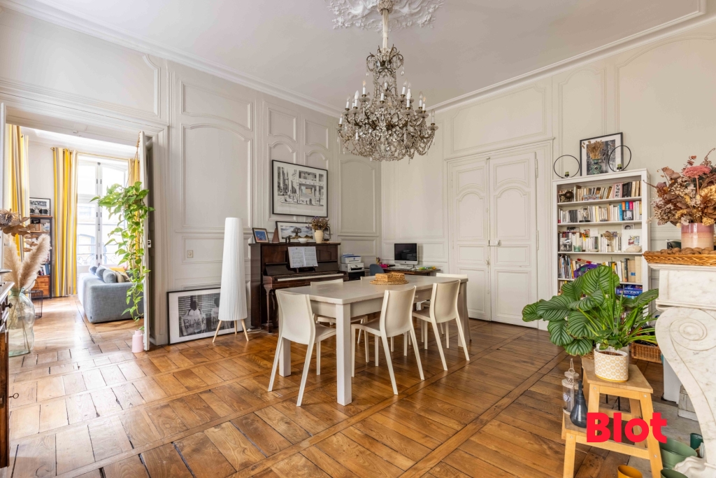 Les deux pièces de réception, développant plus de 63 m², expriment tout le charme et la noblesse du bâti ancien : parquets d'époque, boiseries, cheminées, fenêtres de grande hauteur et remarquables hauteurs sous plafond.