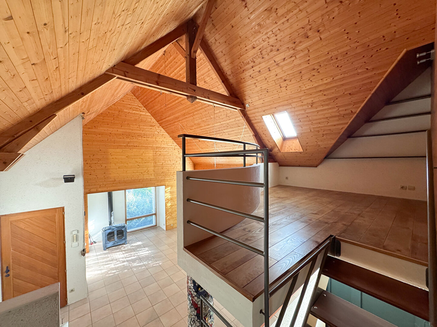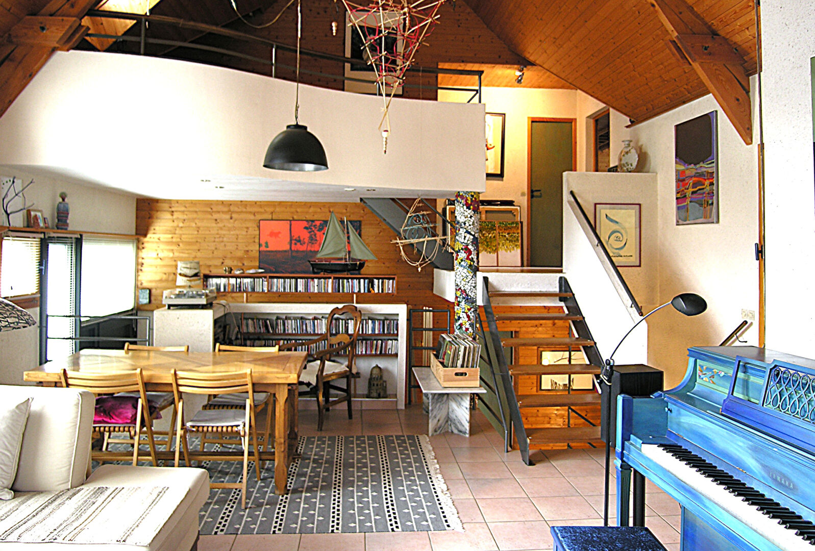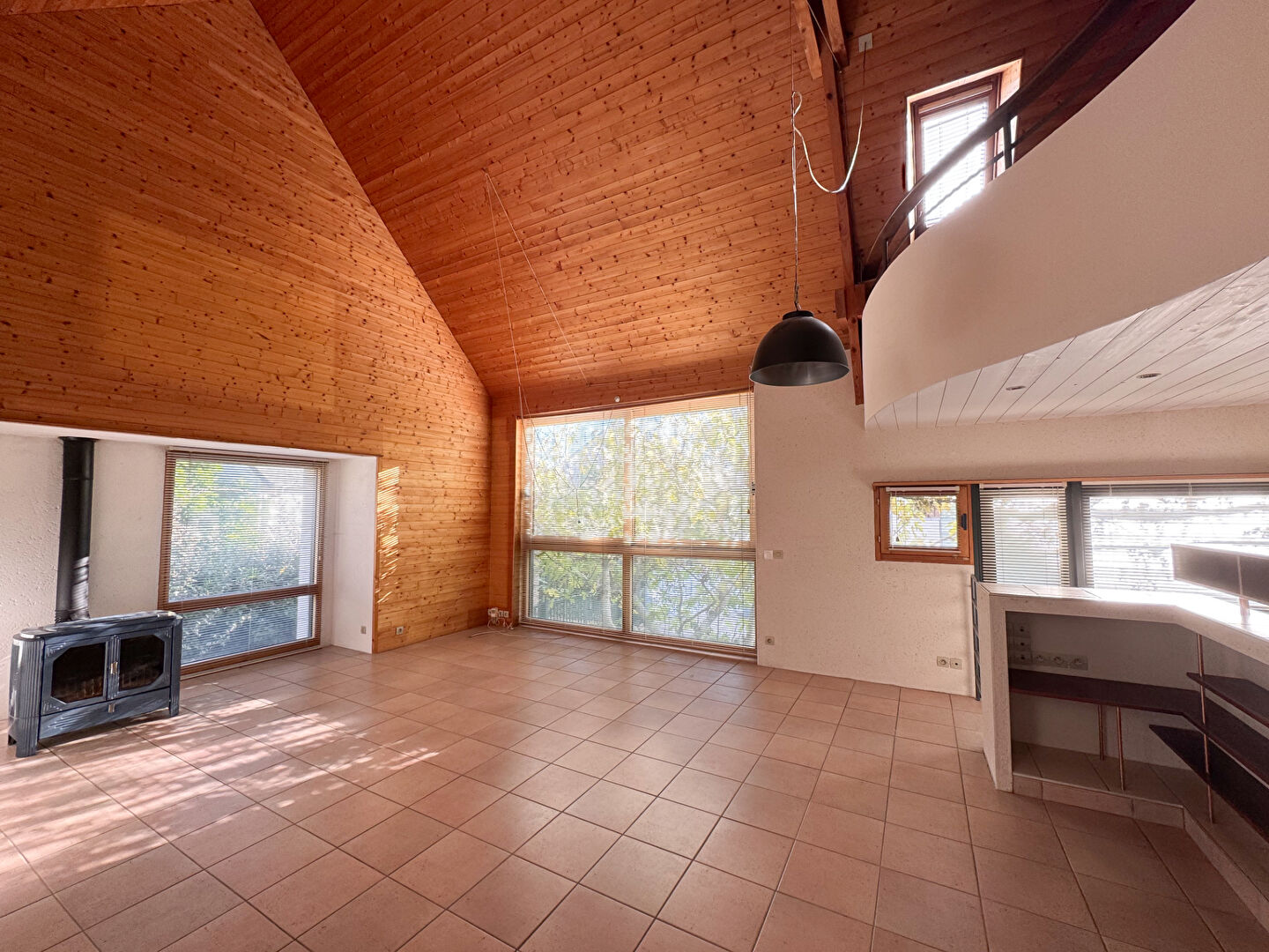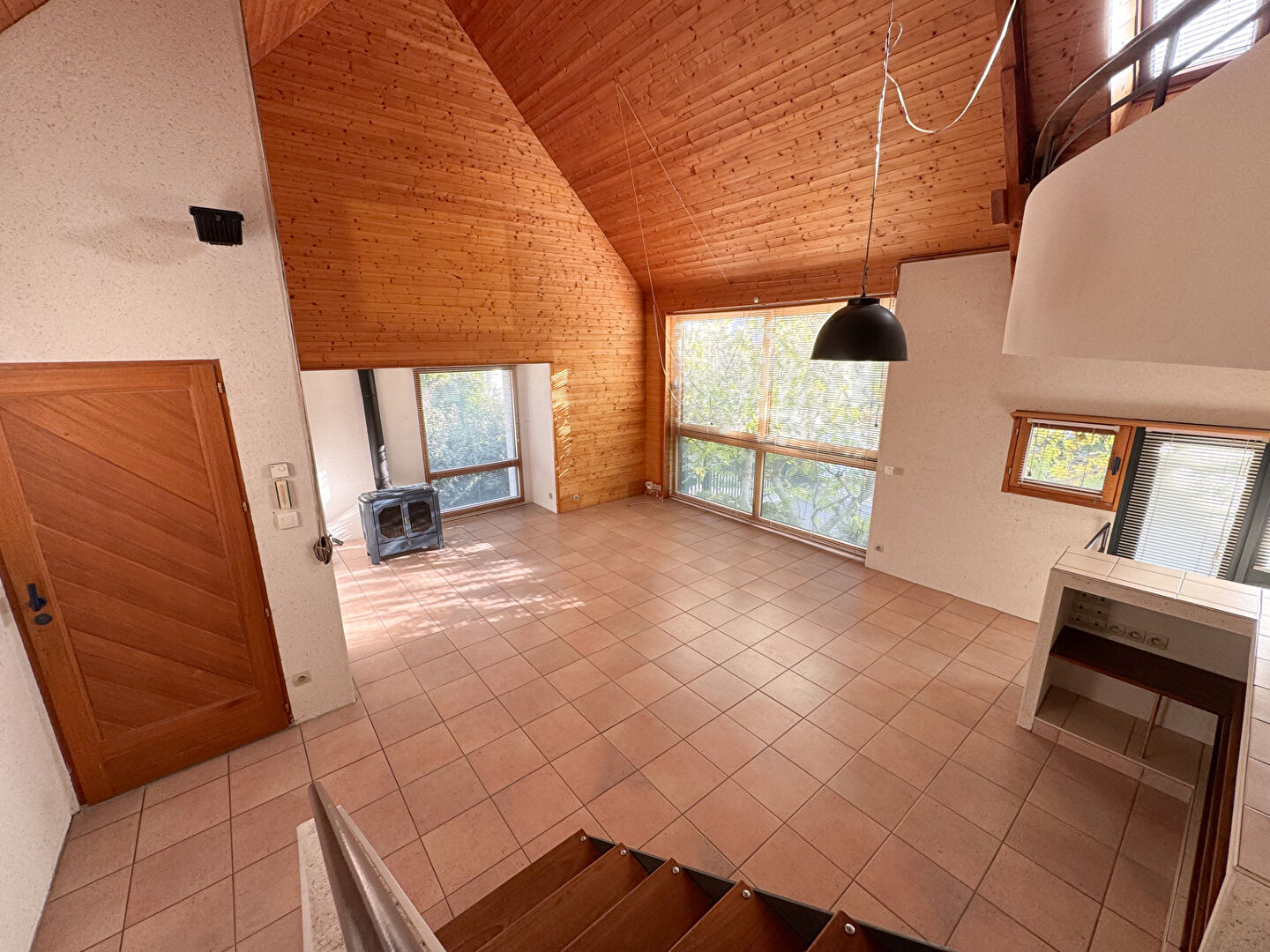 En demi niveau supérieur, pièce centrale de la maison, vous trouverez le très beau salon cathédrale avec son espace bureau suspendu. S'y trouvent également un atelier ou jardin d'hiver et un accès direct au jardin.