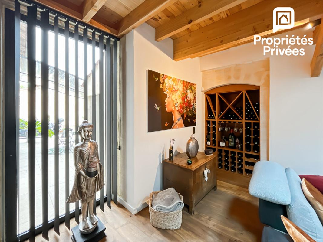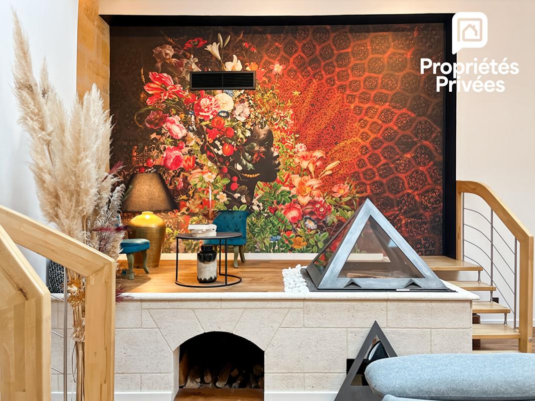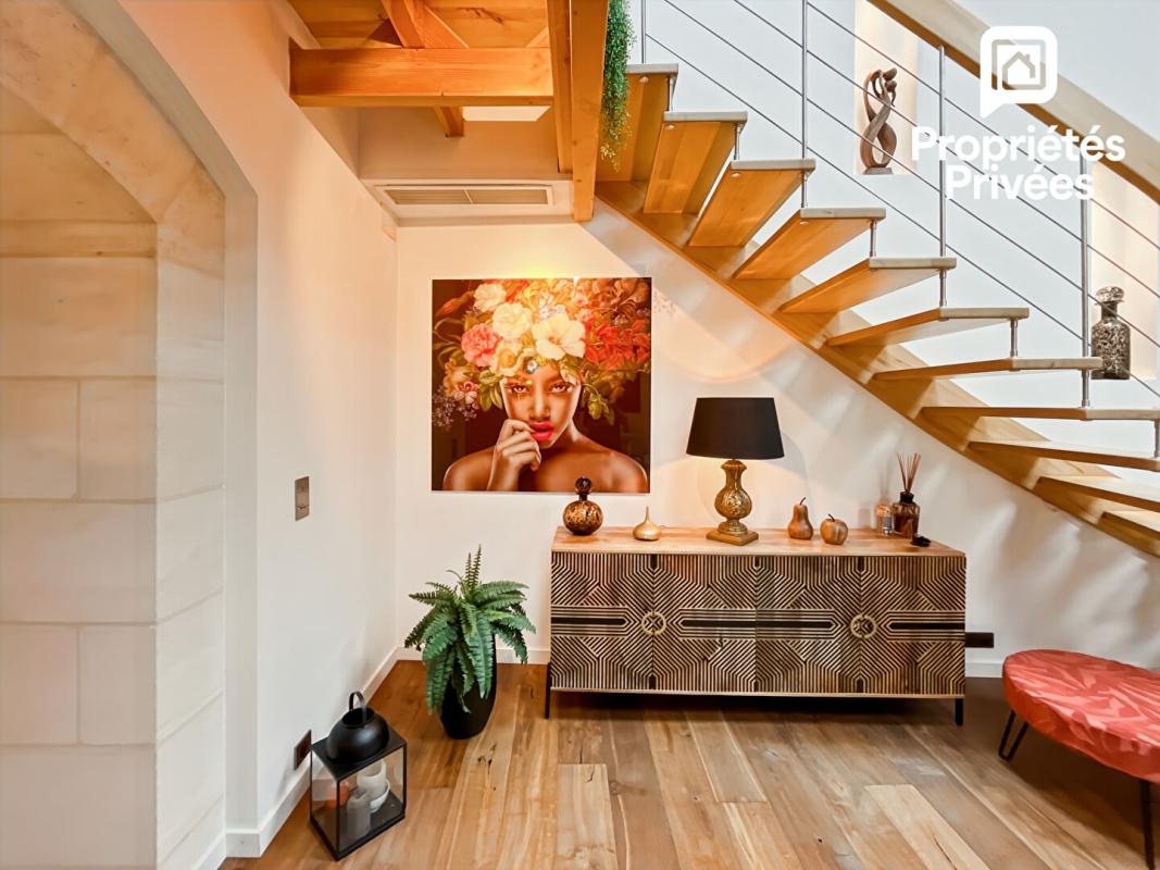 Le séjour, d'environ 65 m², impressionne par sa hauteur sous plafond et son atmosphère chaleureuse. Pierre apparente, lumière traversante et détails soignés composent un espace à la fois élégant et accueillant, sublimé par une cheminée contemporaine, une cave à vin sur mesure et un éclairage parfaitement intégré.