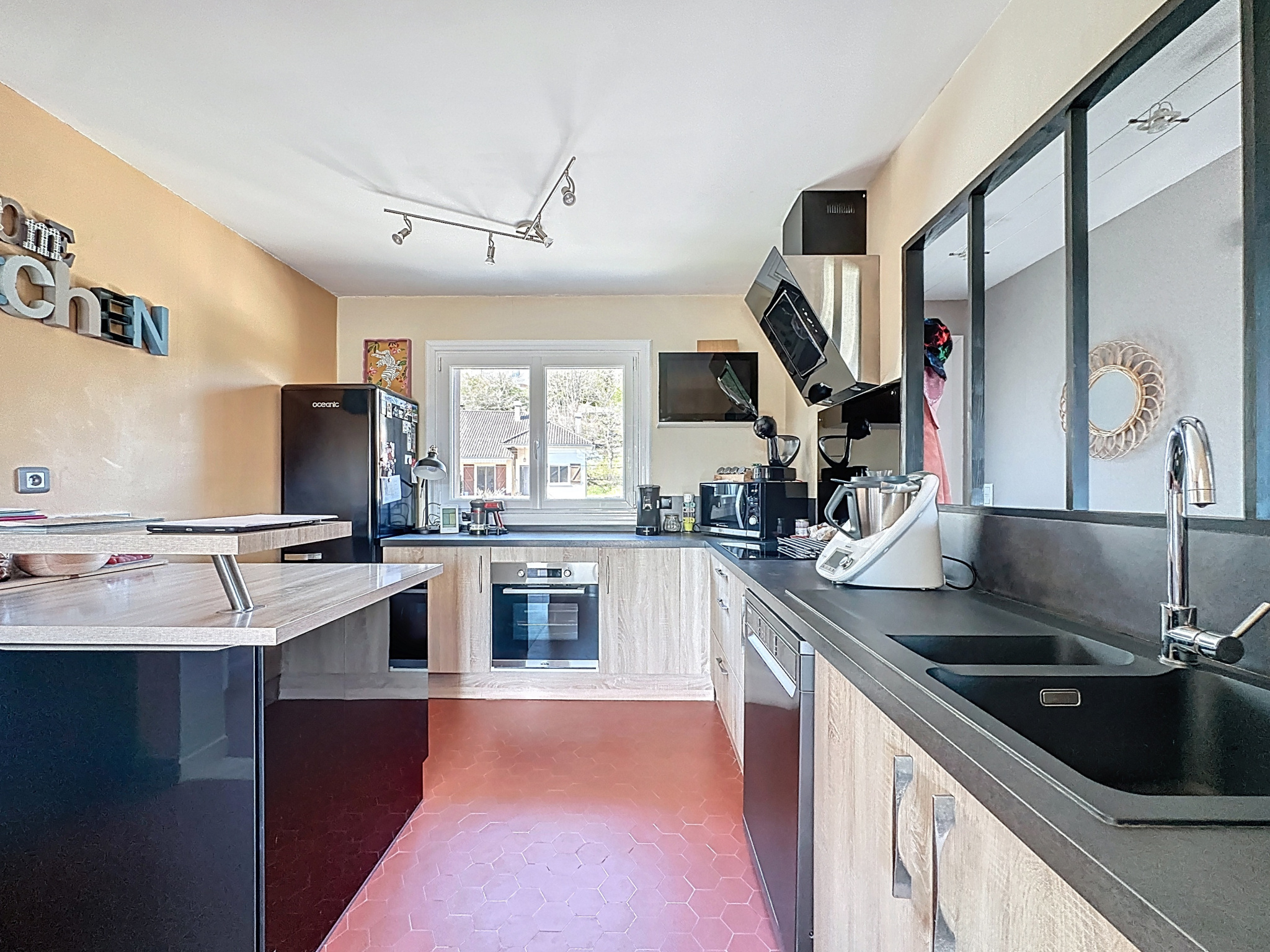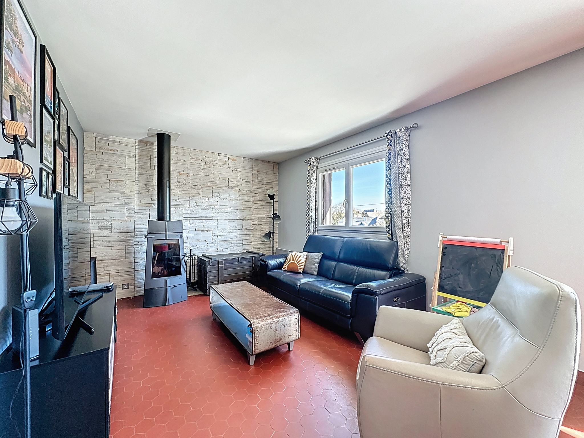 L'arrivée se fait par quelques marches : on monte l'escalier et l'on découvre une entrée qui distribue naturellement l'étage principal, conçu comme un vrai espace de vie. Le salon-séjour s'ouvre sur une belle cuisine équipée, dans une continuité agréable qui invite à partager les moments du quotidien. Un poêle à bois apporte cette chaleur réconfortante que l'on aime retrouver en hiver. Et dès les beaux jours, la maison se prolonge dehors grâce à une terrasse plein Sud, directement accessible depuis le salon-séjour, parfaite pour déjeuner au soleil ou profiter d'une fin de journée au calme.