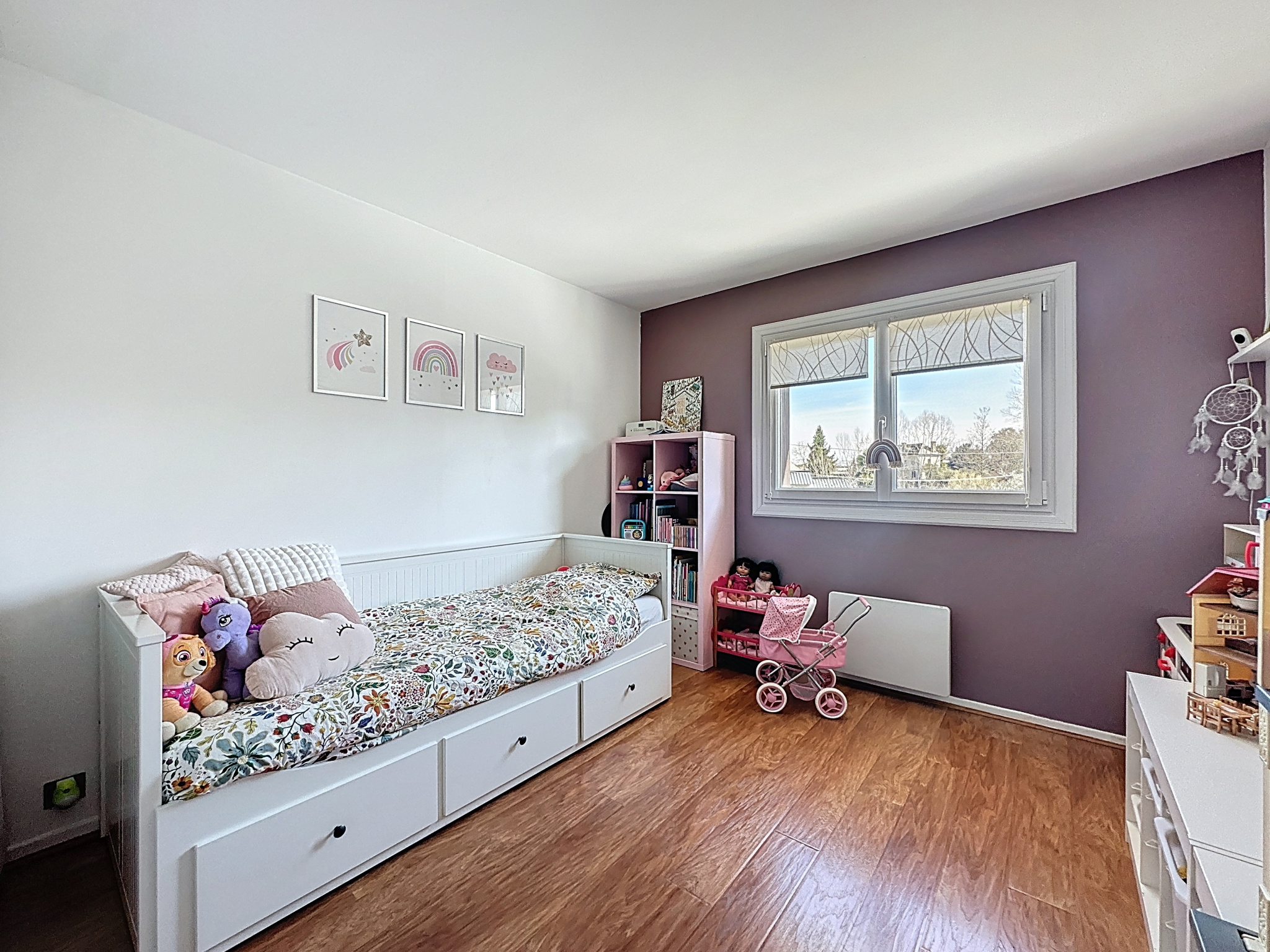 Toujours sur ce niveau, un couloir dessert deux chambres, une salle de bains et des toilettes séparées, pour une organisation claire et pratique.