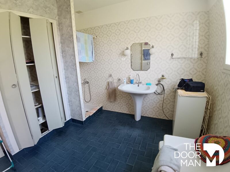 Au rez-de-chaussée entrée avec placard, séjour salon avec cheminée, cuisine, chambre, salle de bains (baignoire douche) avec placards, WC avec lave-mains.