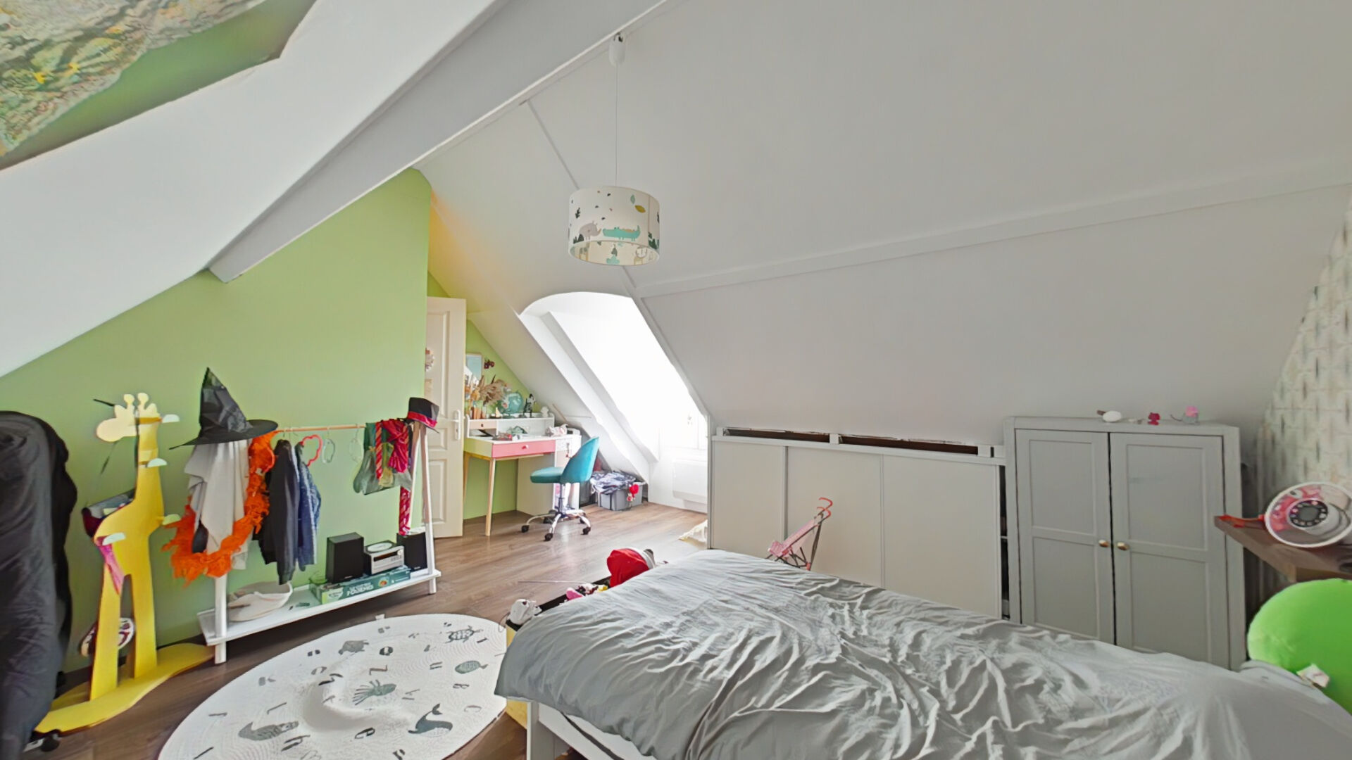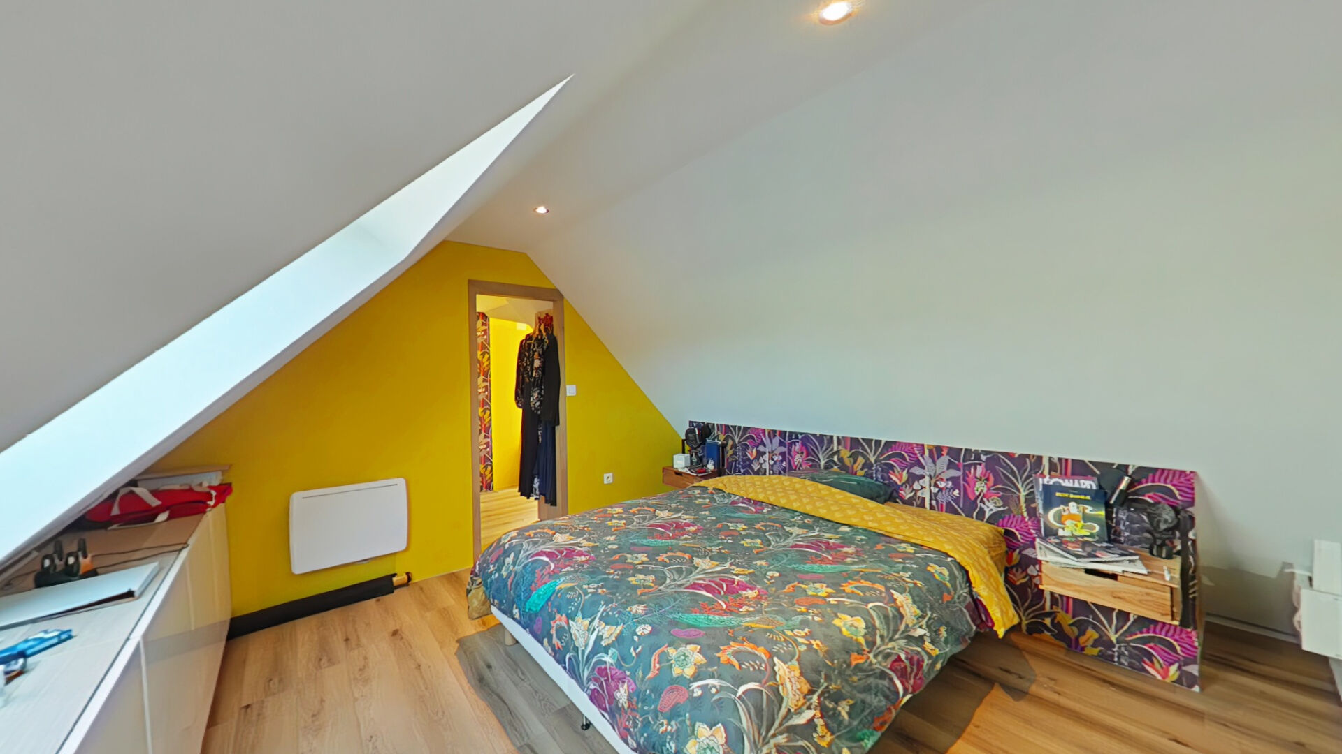 L'étage est divisée en deux parties avec d'un coté une mezzanine et une chambre, et de l'autre coté deux chambres, un dressing et un WC avec point d'eau.