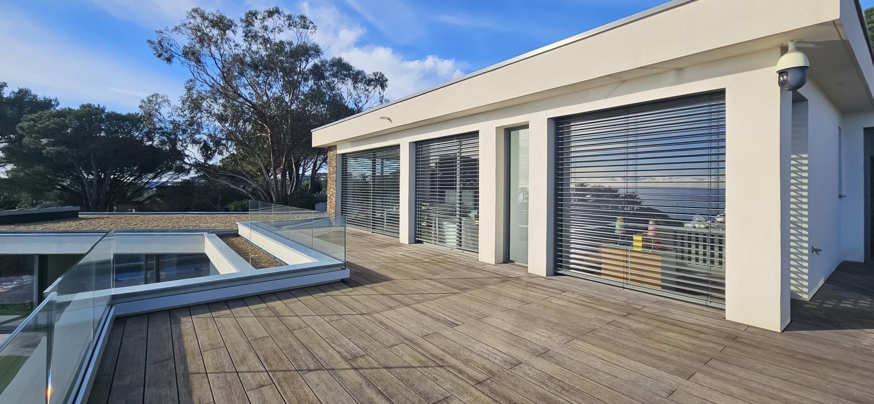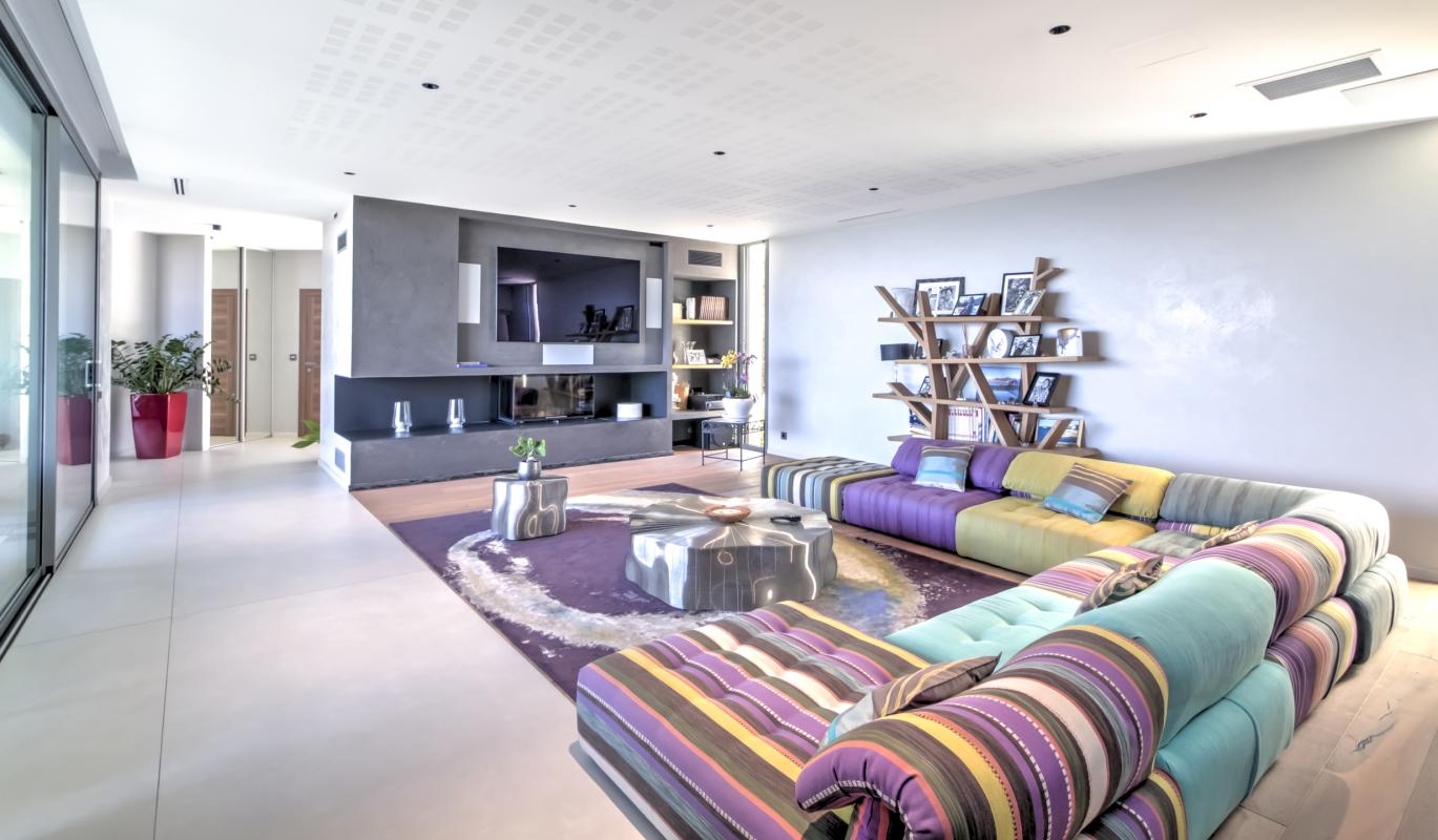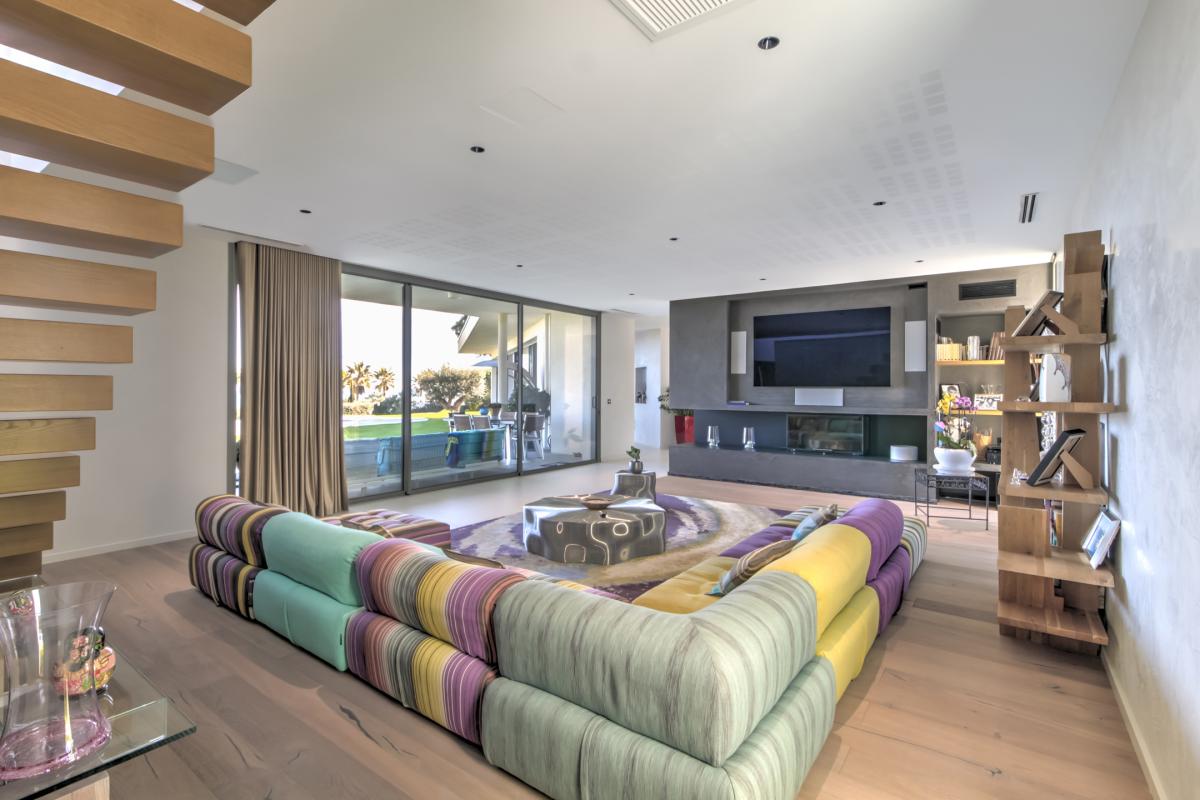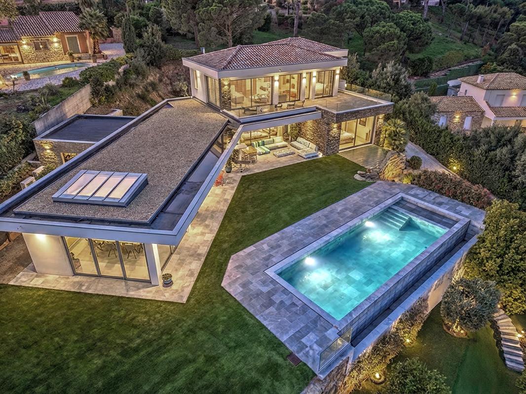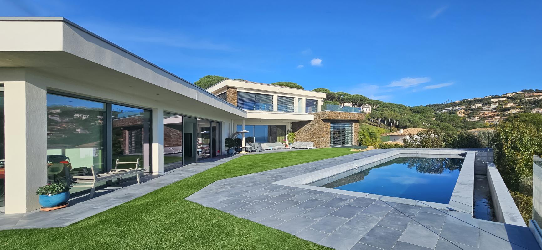 À l'extérieur, l'architecture contemporaine de la villa, sublimée par des touches de pierre naturelle, s'intègre parfaitement à son environnement. Les vastes terrasses prolongent les espaces de vie vers une superbe piscine aux lignes graphiques, posée tel un miroir face à la grande bleue, le tout entouré d'un jardin plat et soigneusement engazonné.