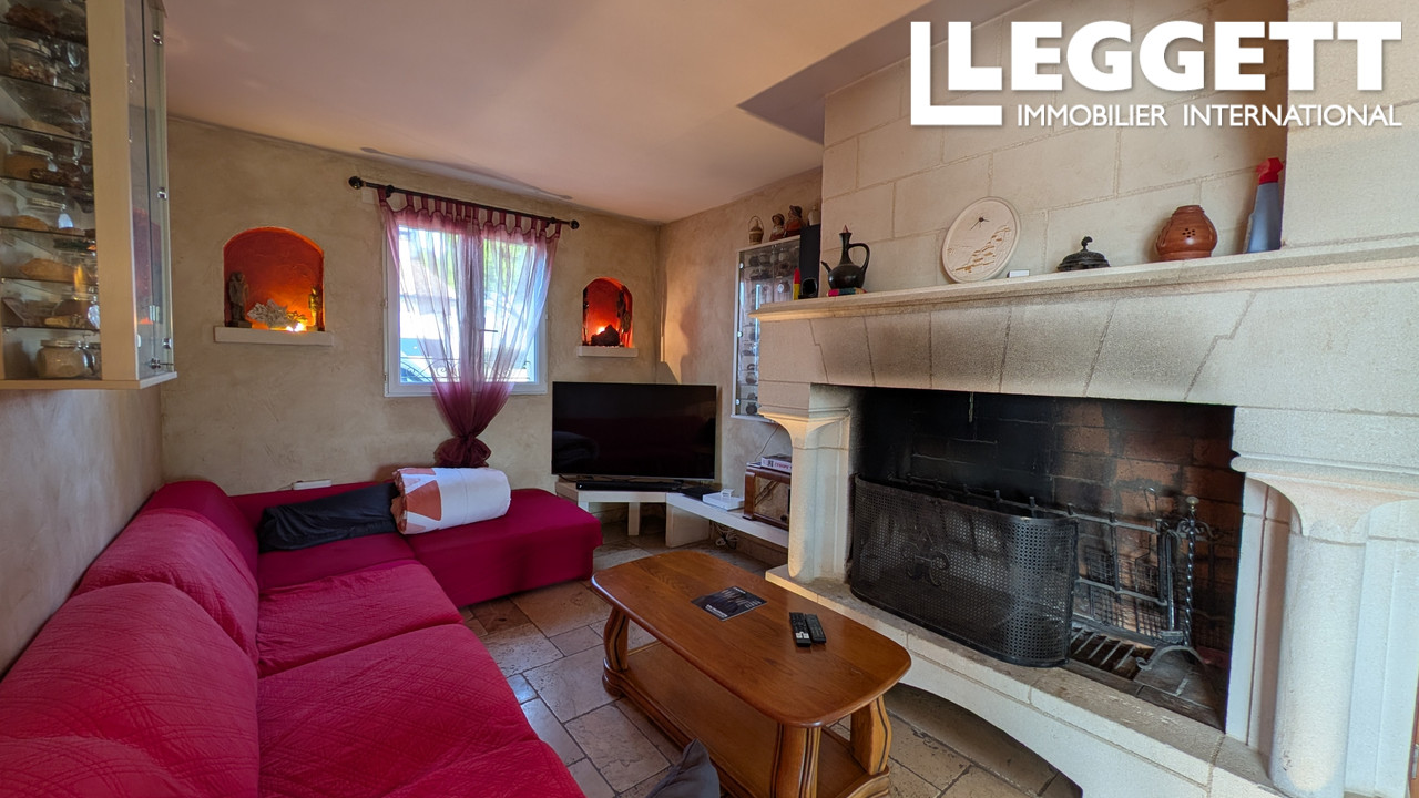 - Salle à manger et salon avec cheminée à foyer ouvert.