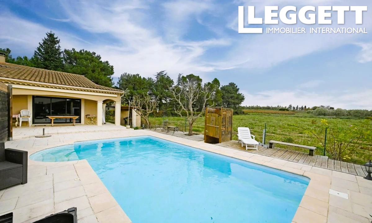 Une grande baie vitrée permet un accès direct à la terrasse et à la piscine.
