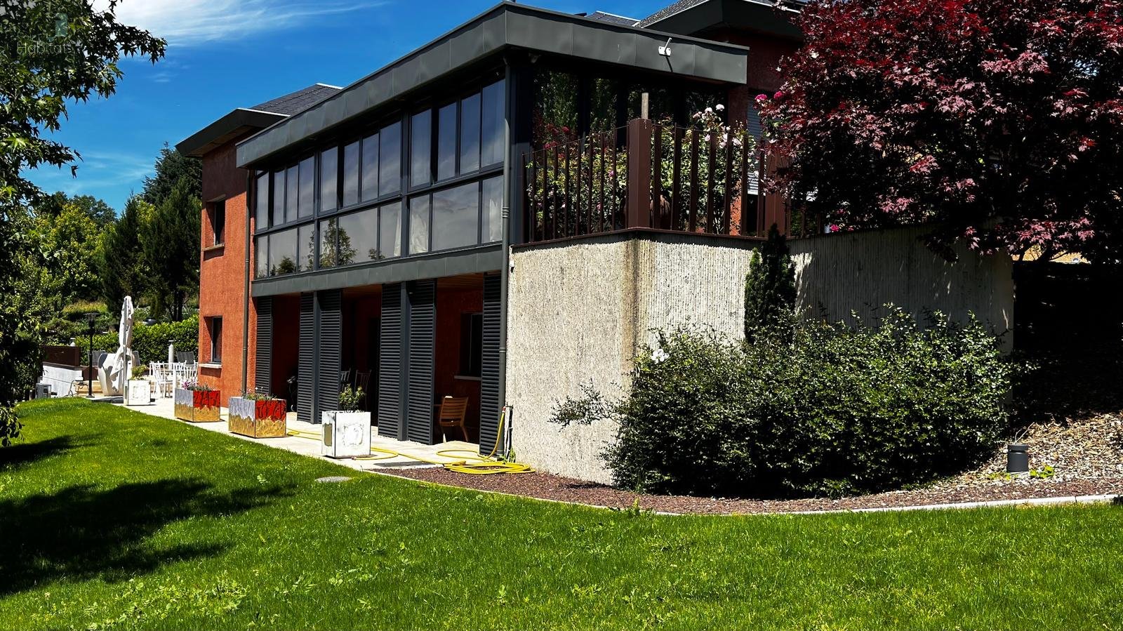 Au rez de chaussée une élégante entrée, un vaste séjour avec insert Corten, une cuisine ouverte, un salon véranda baigné de lumière, un bureau, quatres chambres, une salle d'eau, un WC;. Au rez de jardin: un espace indépendant ideal pour recevoir ou pour une activité complémentaire comprenant séjour cuisine dissimulée, deux chambres ouvrant sur une terrasse, une salle d'eau et wc. Les extérieurs soignement aménagés proposent un jaccuzzi de nage,deux places de pkg, un garage fermé. Une demeure rare aux finitions haut de gamme.