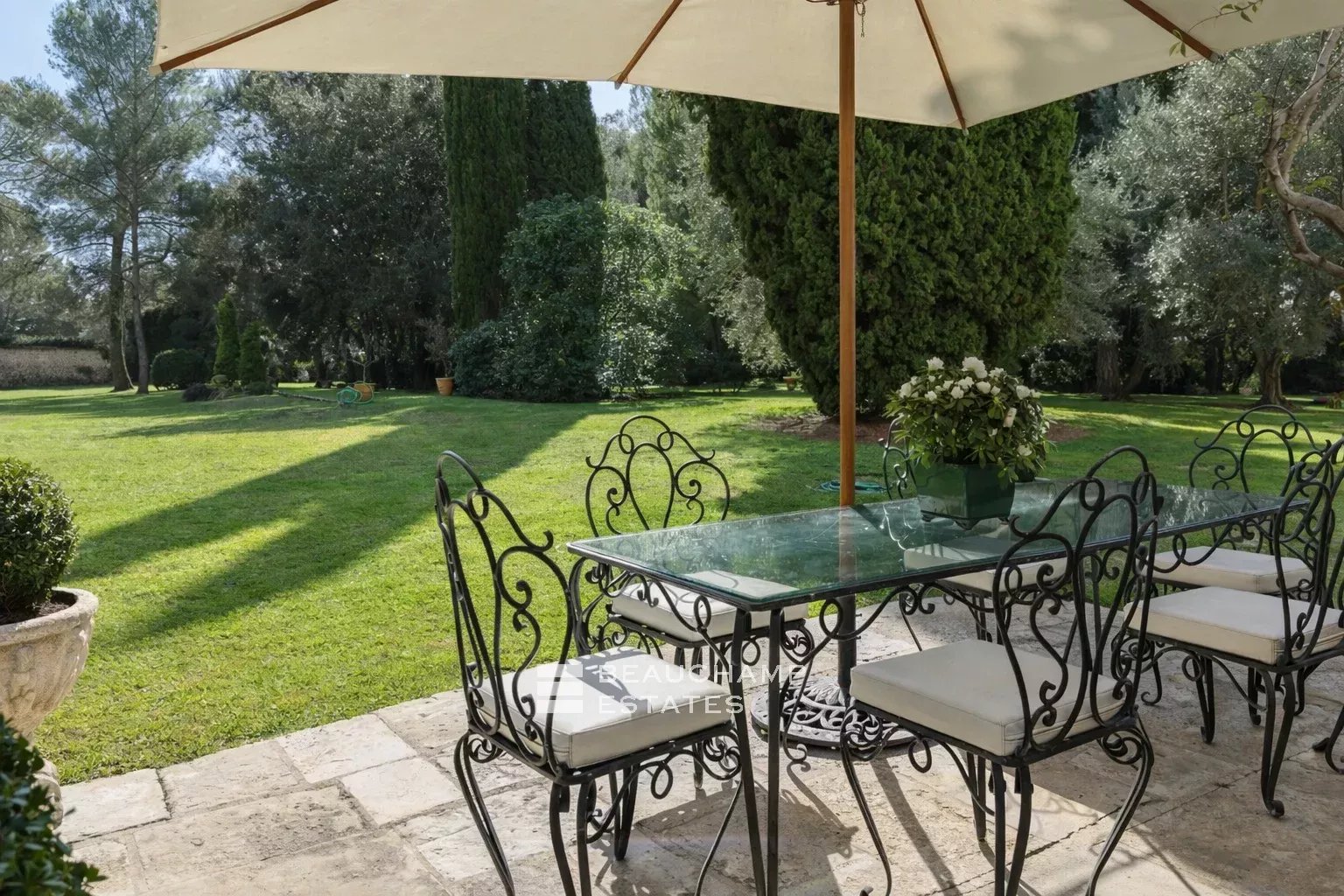 Le parc est l’un des grands atouts de la propriété? offre de grands espaces ouverts et une atmosphère paisible. La grande piscine s’intègre harmonieusement dans ce cadre verdoyant.