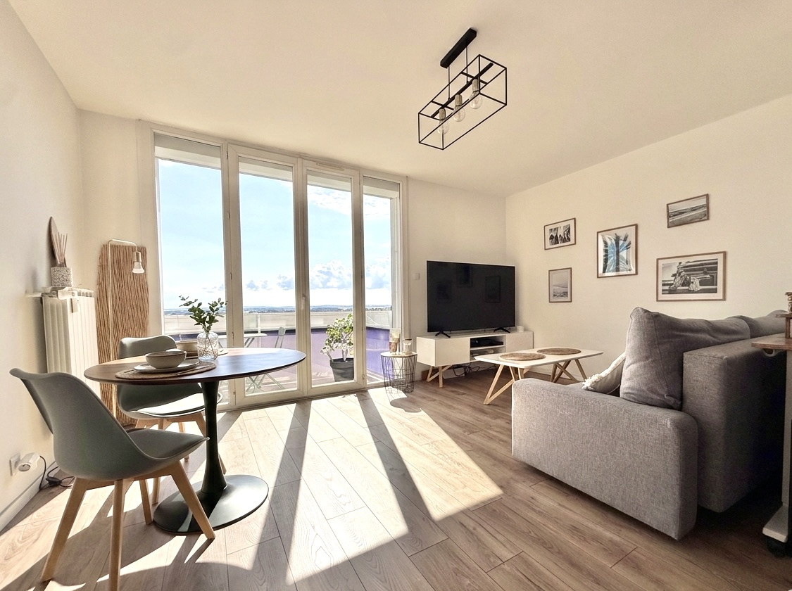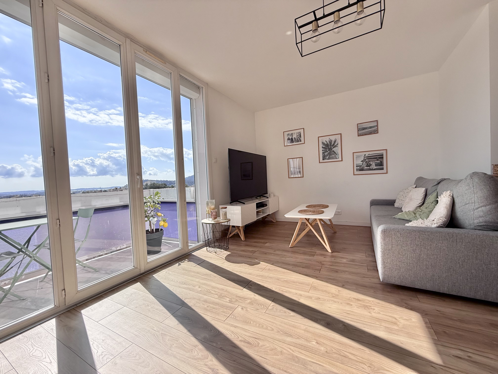 Situé au dernier étage d'une résidence avec ascenseur, en plein coeur du centre-ville, ce superbe appartement de type 2 traversant Nord-Sud séduit immédiatement par sa luminosité exceptionnelle et ses vues spectaculaires. Il ouvre sur une vaste terrasse de 20,50 m2 ainsi que un balcon de 5,50 m2, offrant une double perspective remarquable : d'un côté, une vue dominante sur le centre historique, et de l'autre un horizon dégagé s'étendant jusqu'à la mer. Baigné de lumière tout au long de la journée, l'appartement se présente en excellent état et bénéficie de prestations contemporaines de qualité : cuisine aménagée, double vitrage, climatisation réversible et volets roulants électriques. Un garage ainsi qu'une cave complètent ce bien rare, idéalement situé, alliant confort moderne, emplacement privilégié et vues d'exception.