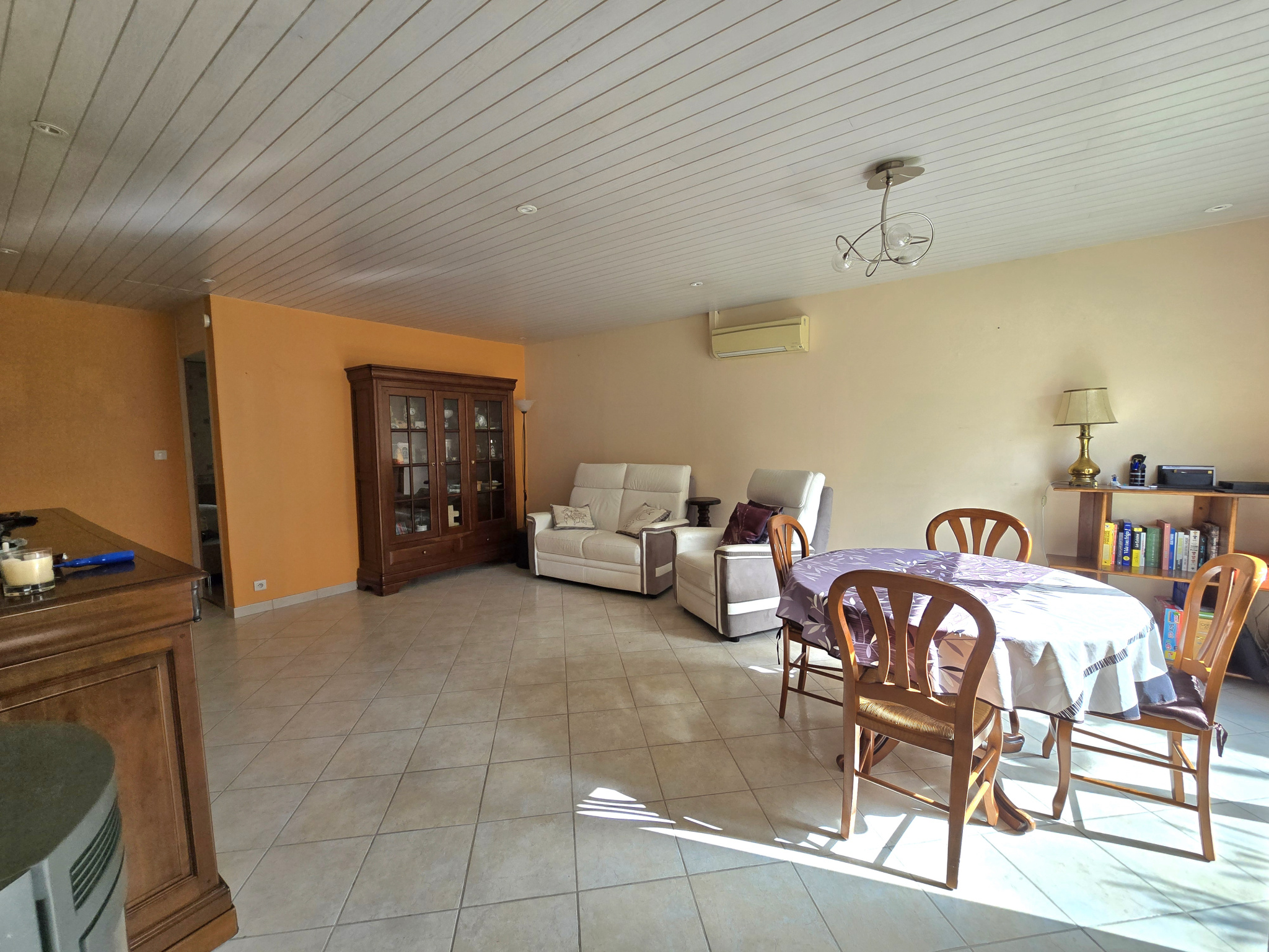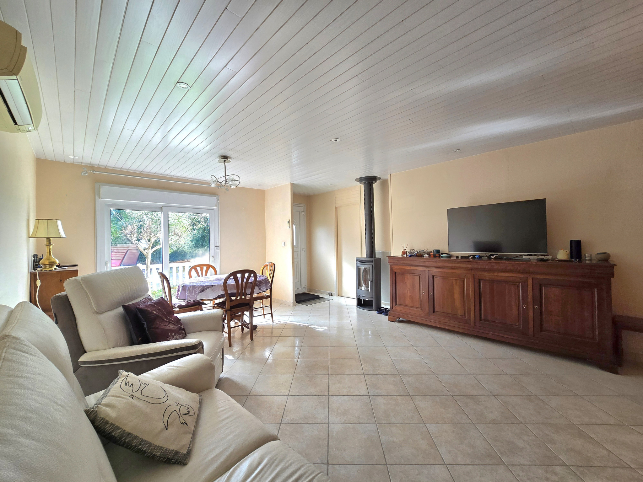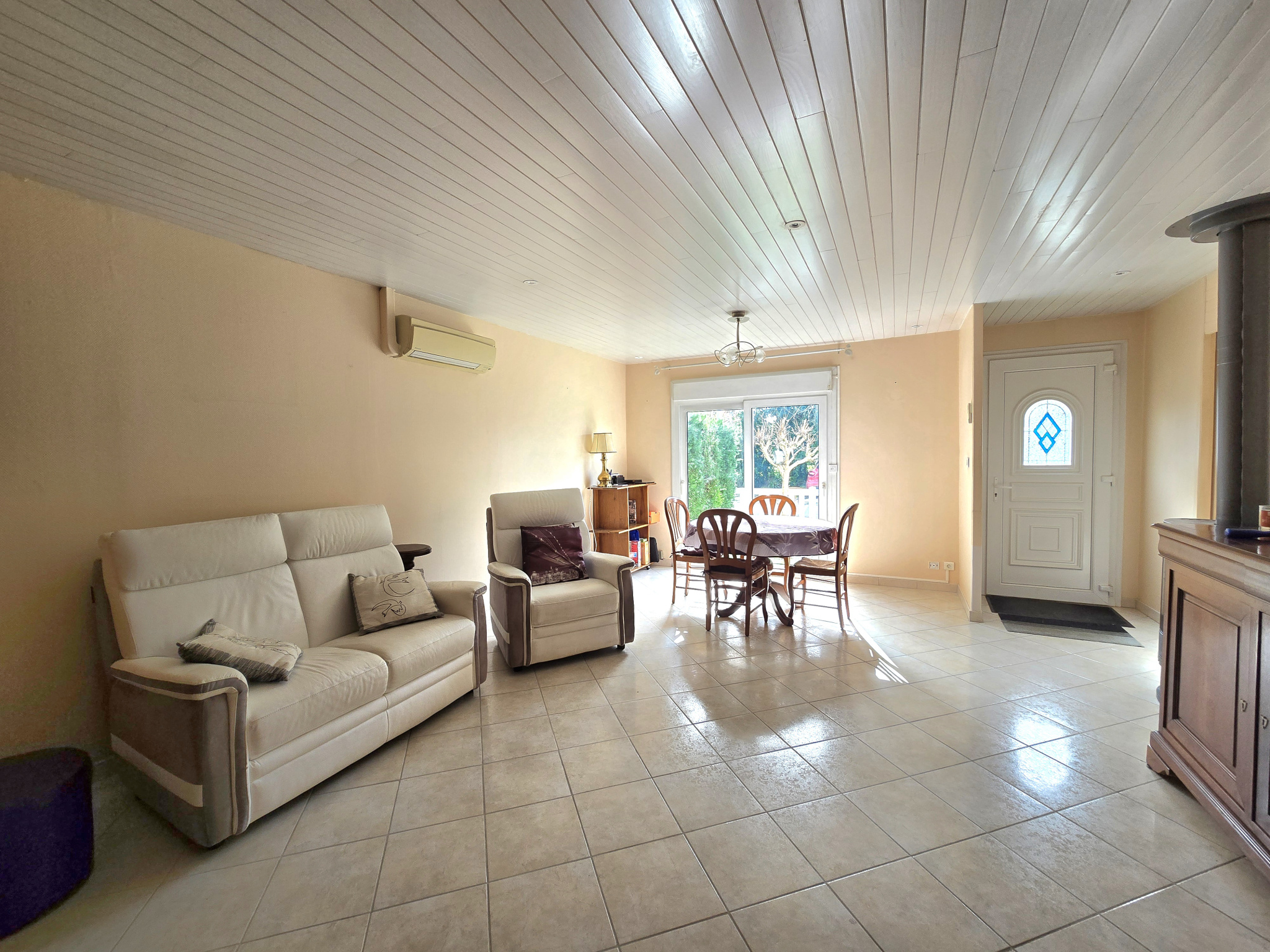 Idéalement située à proximité du centre ville, agréable maison de plain pied située au calme dans un lotissement résidentiel, cette maison se compose d'un grand séjour de 26 m2 exposé sud-ouest avec un poêle à bois et une climatisation réversible. La cuisine indépendante aménagée et équipée peut s'ouvrir sur le séjour. L'espace nuit se compose de 3 chambres, une salle d'eau récente avec douche et un wc séparé, le tout avec une climatisation réversible. Un cellier attenant à la cuisine complète l'ensemble. Elle possède un grand garage de 29 m2 avec une sortie sur le jardin, ainsi qu'un espace mezzanine, un wc et un coin buanderie dans le garage. Vous pourrez profiter d'une très belle terrasse de 25 m2 et d'un jardin avec une dépendance. A visiter sans tarder.