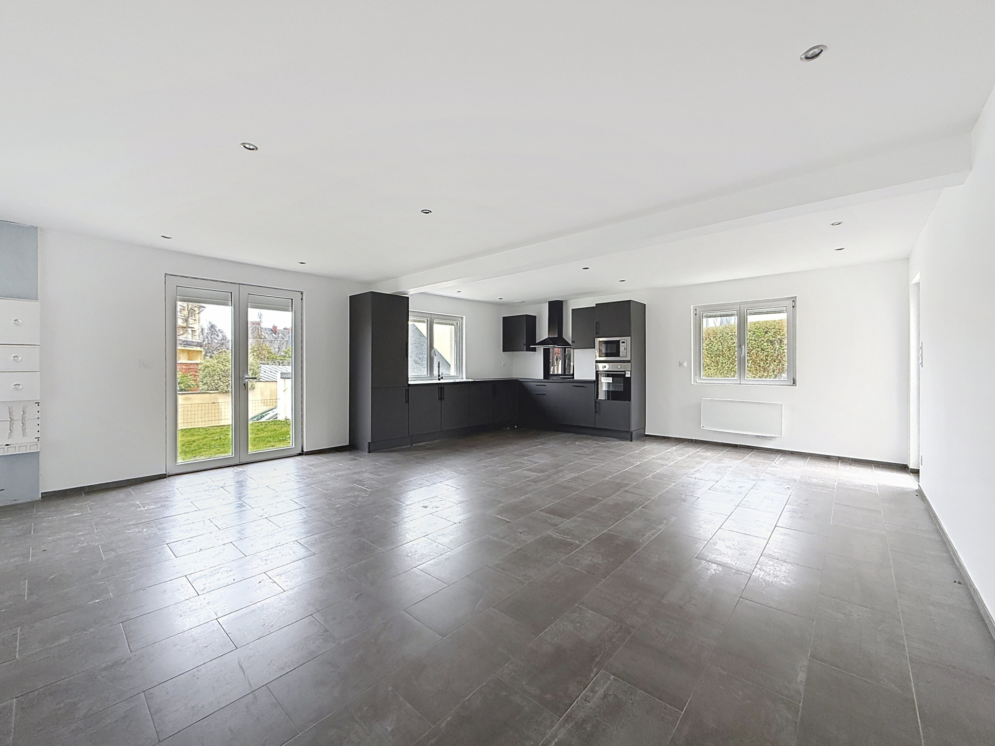 Une Entrée ouvert sur une VASTE et LUMINEUSE pièce de vie avec un coin cuisine AE, 2 chambres, Salle d'eau et wc.