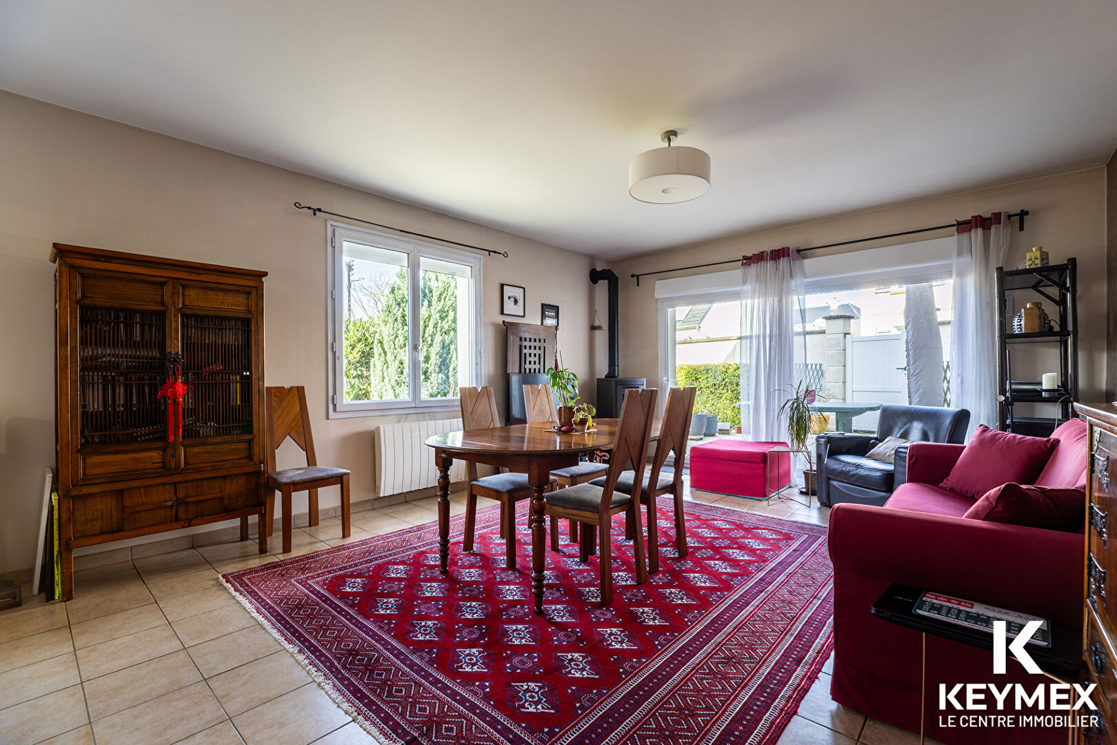 Une entrée sur un séjour lumineux, avec poêle à granulés, une cuisine aménagée et équipée récente et fonctionnelle, un WC individuel.
