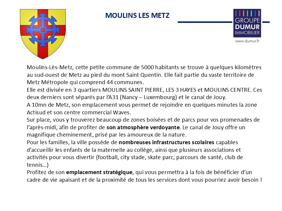 Située à MOULINS MES METZ dans un quartier calme, résidentiel et recherché, à proximité immédiate des axes autoroutiers, à moins de 10 minutes en voiture des zones commerciales d'Augny et du centre WAVES, et parfaitement desservi par les transports en commun.