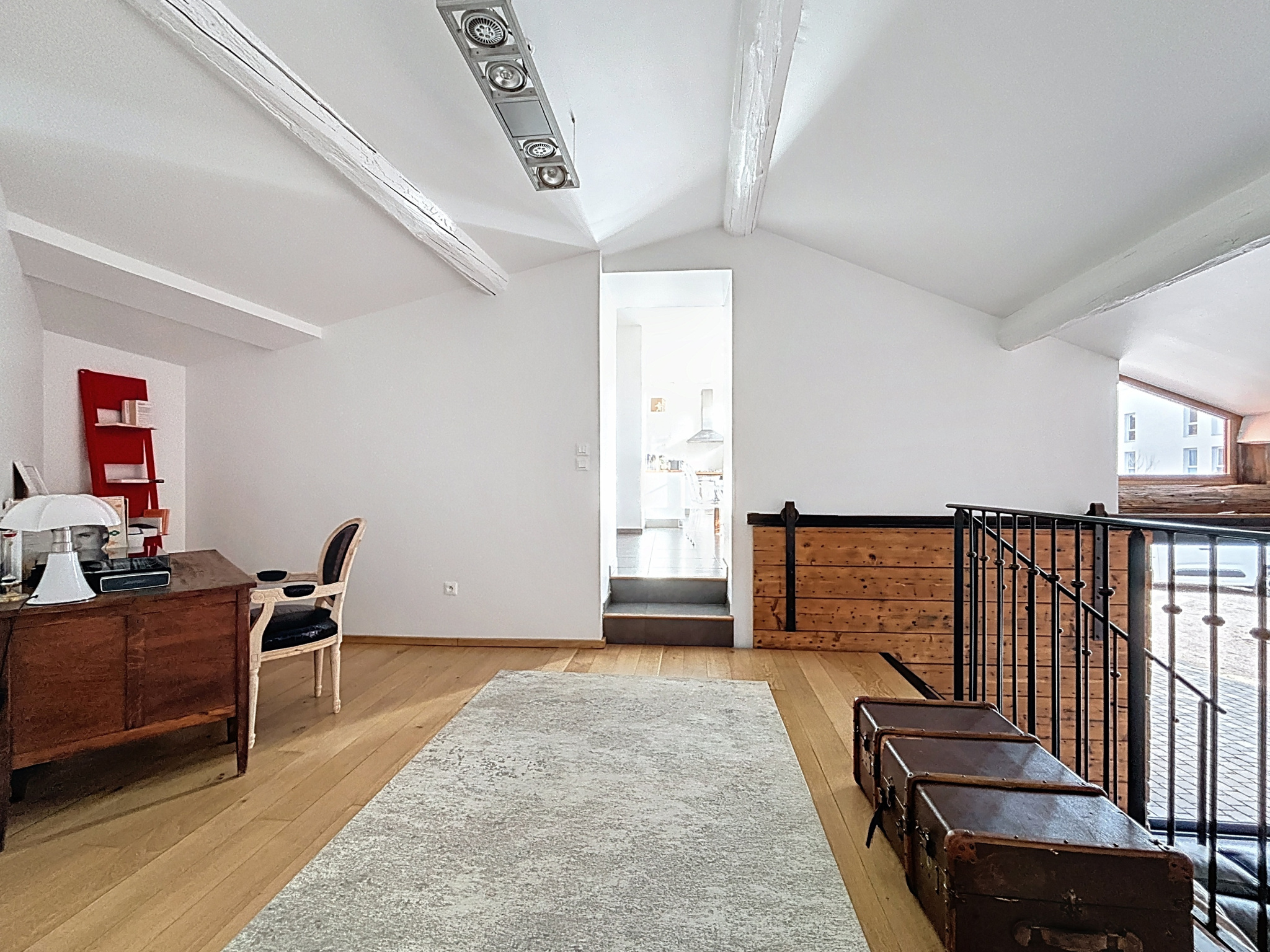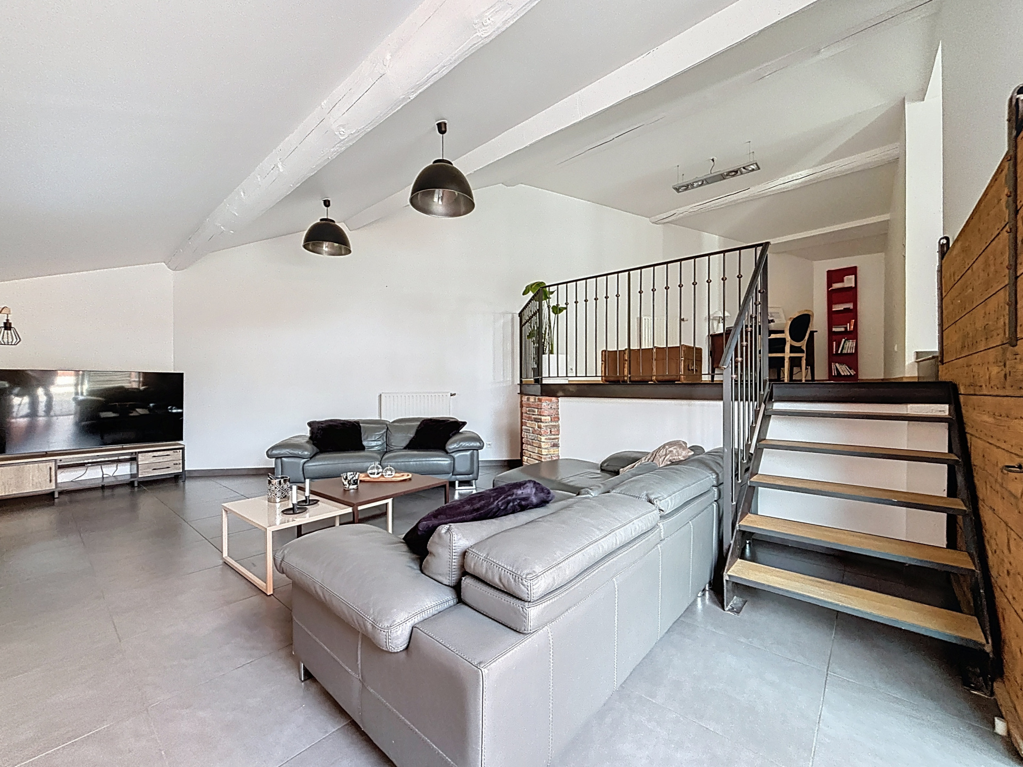 un grand salon lumineux, intégrant un espace bureau idéal pour le télétravail