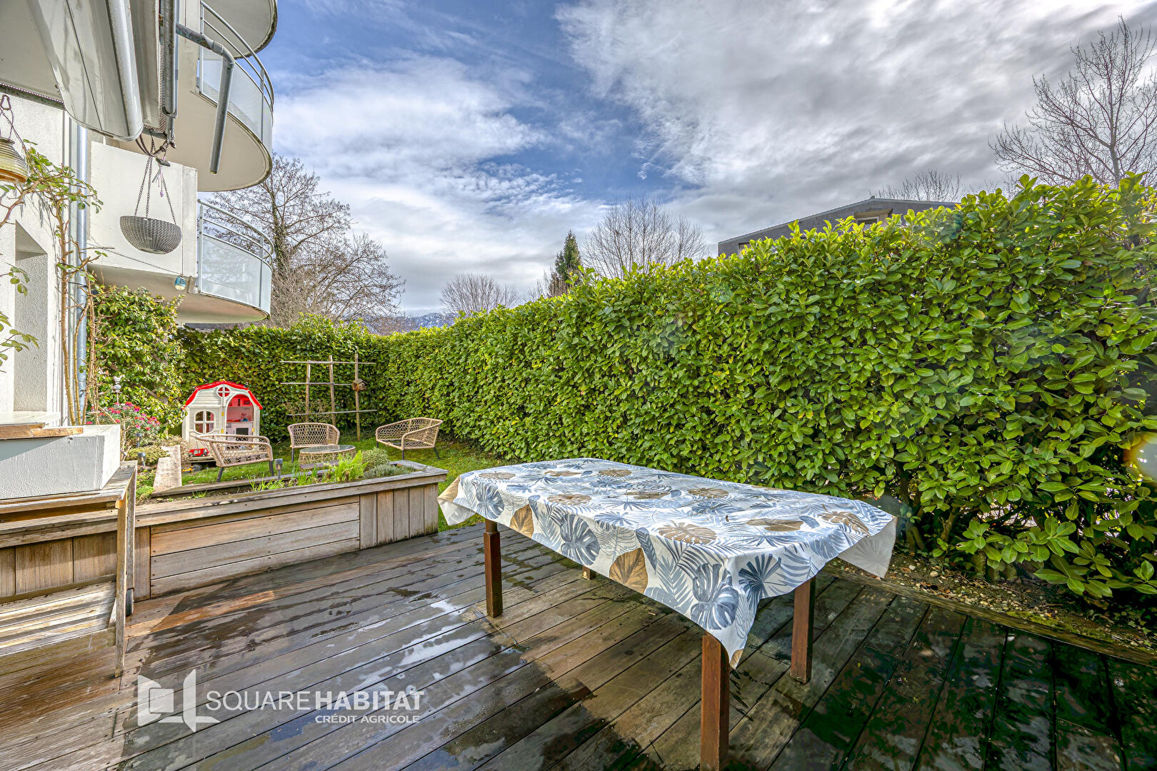 À l'extérieur, vous profiterez d'un agréable jardin privatif avec terrasse en bois équipée d'un store, idéal pour vos moments de détente ou pour recevoir.