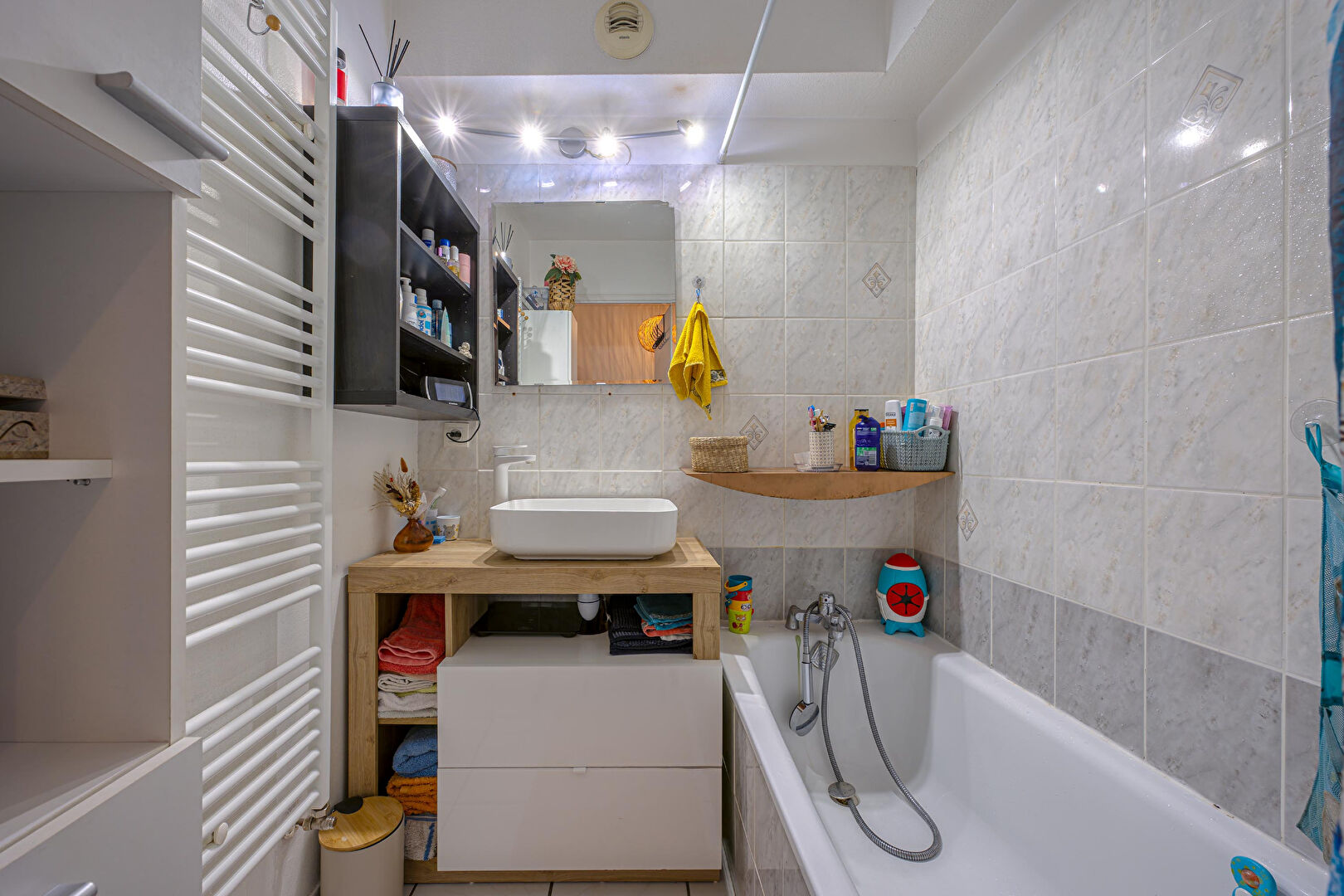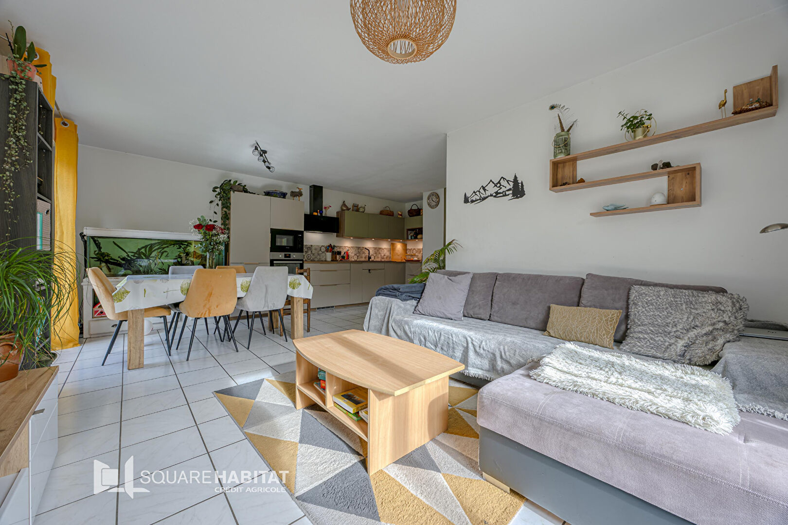 L'appartement se compose d'une entrée, un séjour lumineux avec cuisine ouverte, deux chambres, une salle de bain avec baignoire, un WC indépendant, une buanderie pratique pour le rangement et le quotidien.