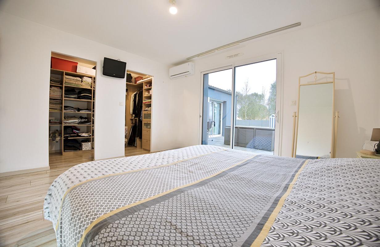 d'un hall d'entrée, d'une cuisine semi-ouverte aménagée et équipée avec cellier, d'un vaste séjour lumineux d'environ 58 m², d'un WC, d'une salle d'eau, ainsi que de 2 chambres dont une belle suite parentale avec dressing.