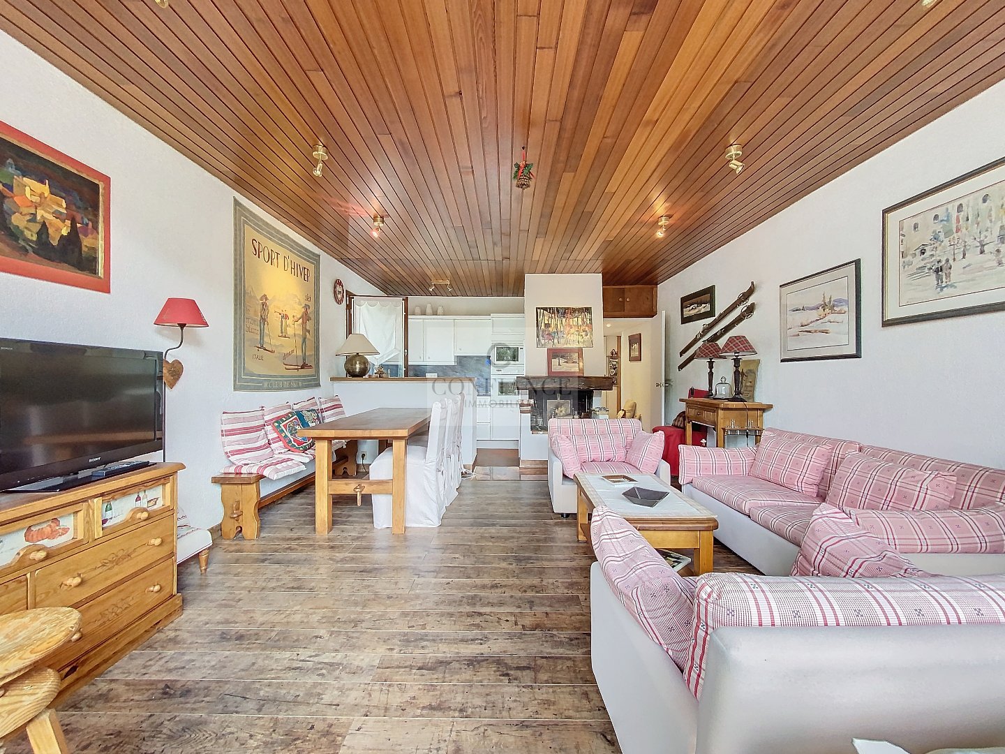 Calme et baigné de lumière, l'appartement bénéficie d'une exposition plein Sud, sans aucun vis-à-vis, avec une vue dégagée sur les pistes et la verdure. Il se compose d'un grand salon chaleureux avec cheminée ouvrant sur la terrasse, d'une cuisine ouverte, d'une très grande chambre avec deux fenêtres, d'une vaste salle de bains avec fenêtres et WC, ainsi que de nombreux dressings.