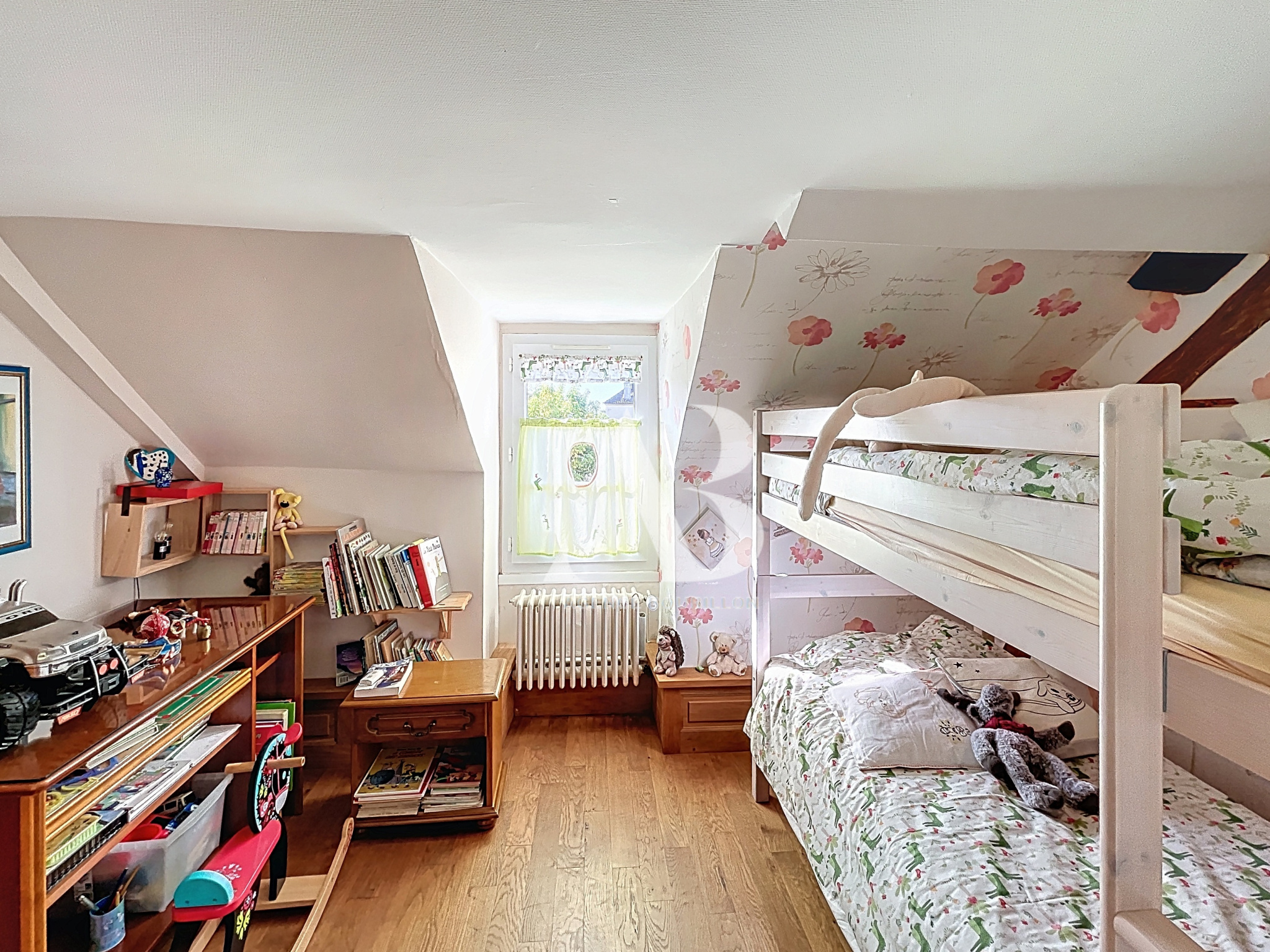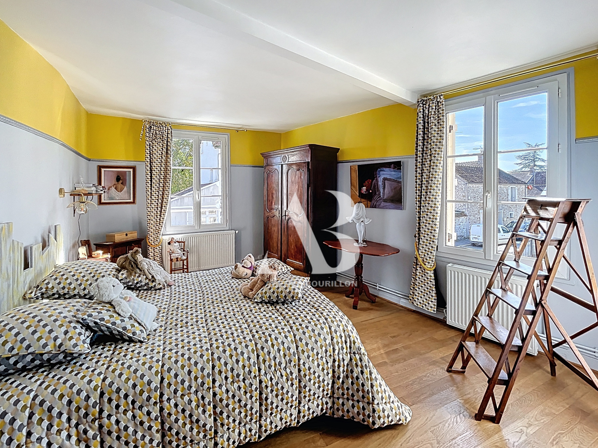 À l'étage (aile droite) : vous profitez de deux chambres dont une de 19m2, un bureau et une salle de bains avec baignoire et douche..