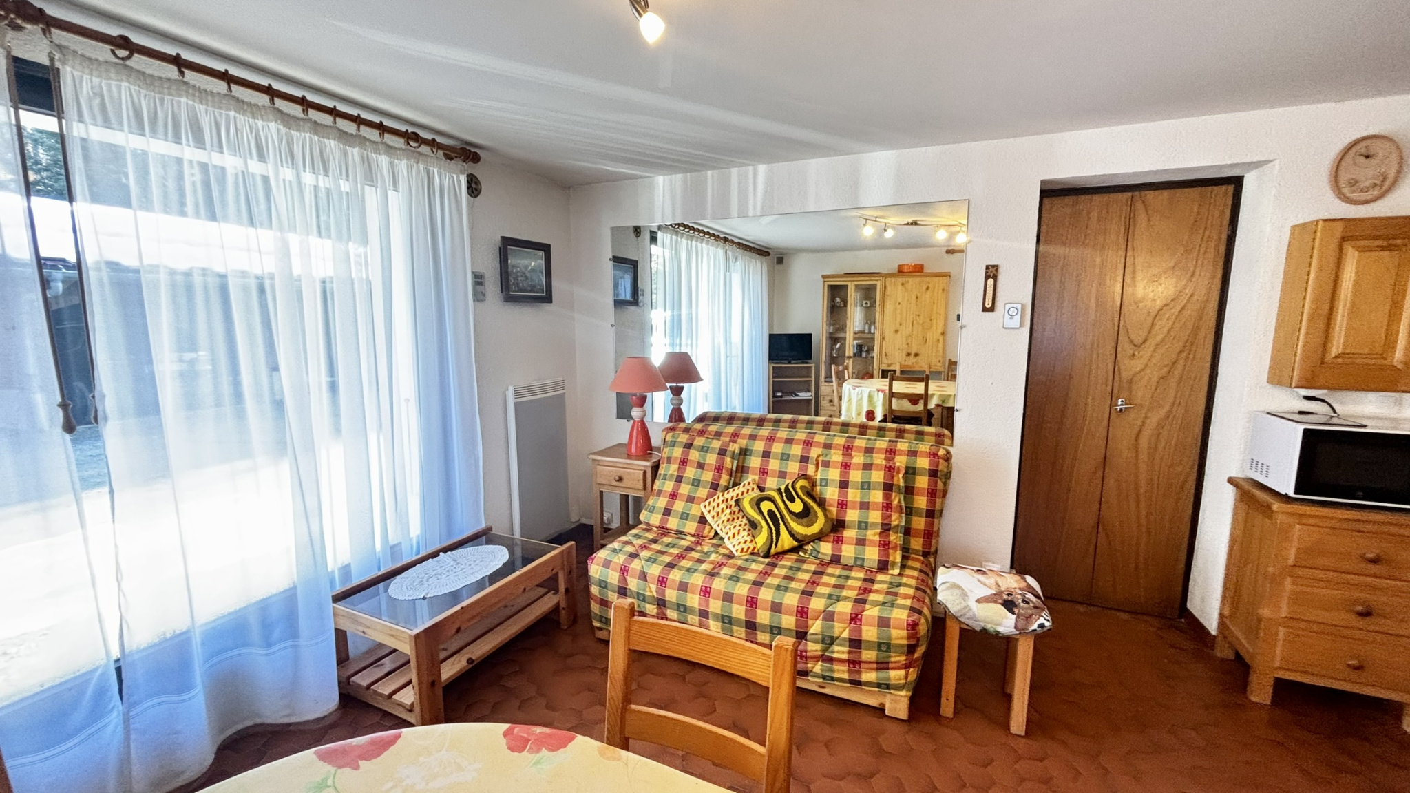 L'appartement se compose d'une entrée avec rangements, d'un grand séjour avec cuisine ouverte, d'une salle de douche, ainsi que d'une chambre double et une cabine avec lits superposés. Sa configuration permet d'accueillir jusqu'à 4/6 couchages confortablement, idéal pour un pied-à-terre à la montagne ou un investissement locatif.