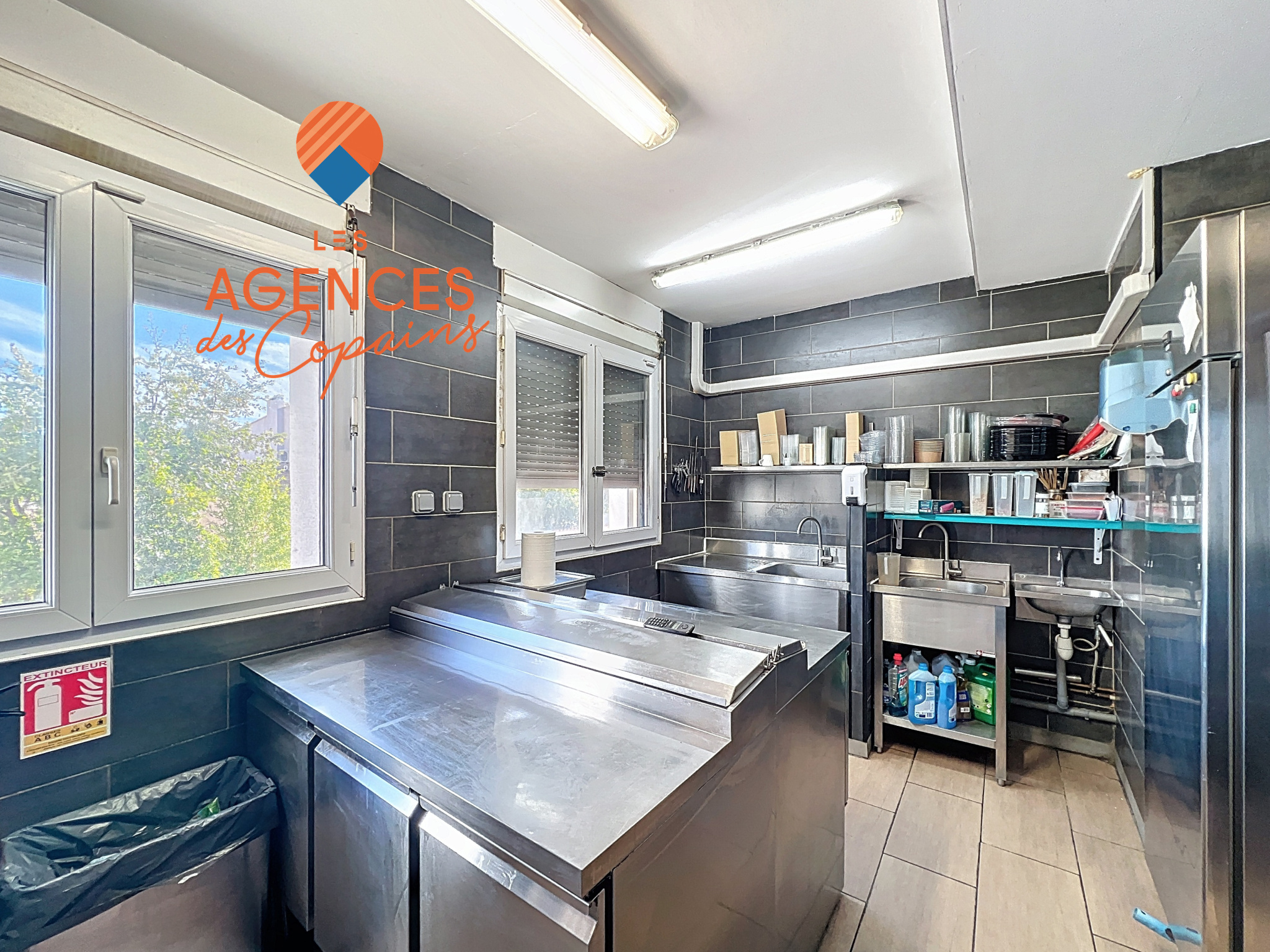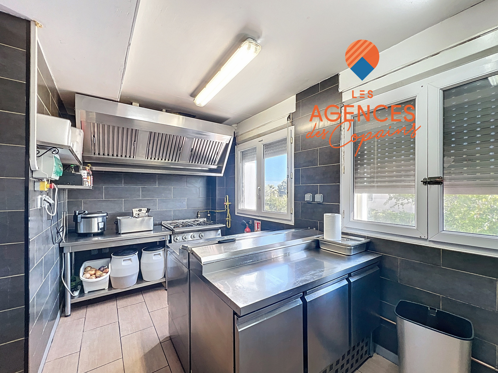 Cuisine équipée aux normes avec coupures d'urgence pour gaz et électricité, Banque d'exposition réfrigérée (2.5 m), Armoire frigo vitrée à boisson, Congélateur 2 portes vitrées, 3 frigos, feux, friteuse, hotte, possibilité d'aménager une mezzanine de 40m2.