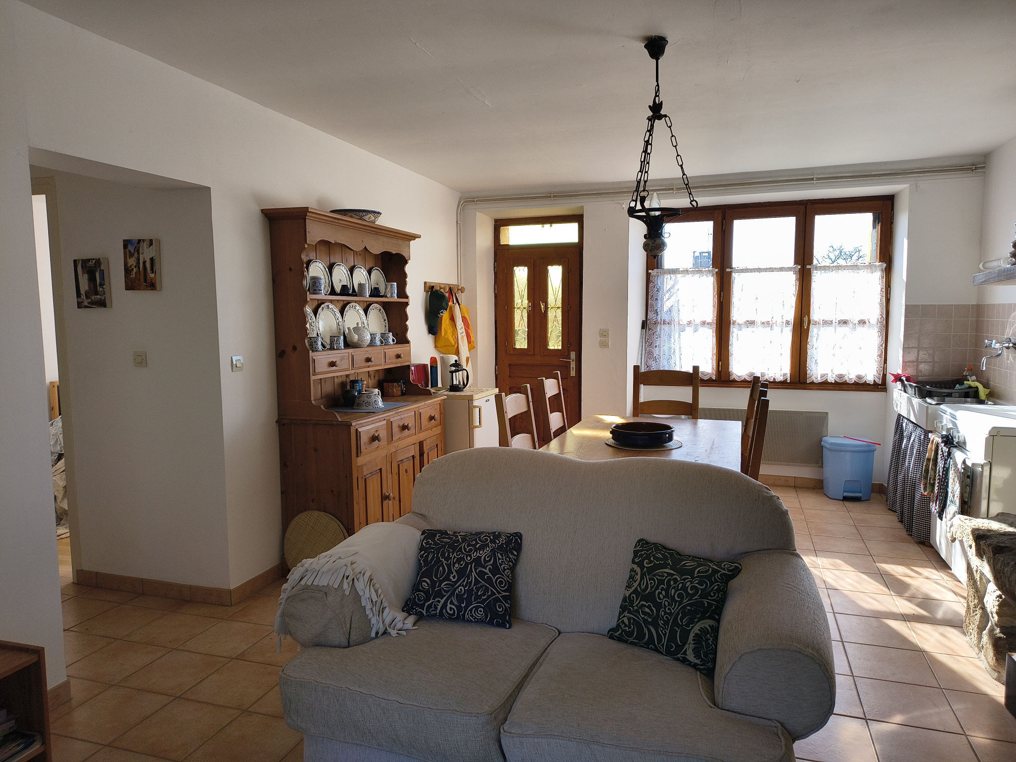Vous entrez directement dans la pièce de vie avec un coin cuisine et un salon cocooning. Un couloir dessert une salle d'eau ainsi que deux chambres.