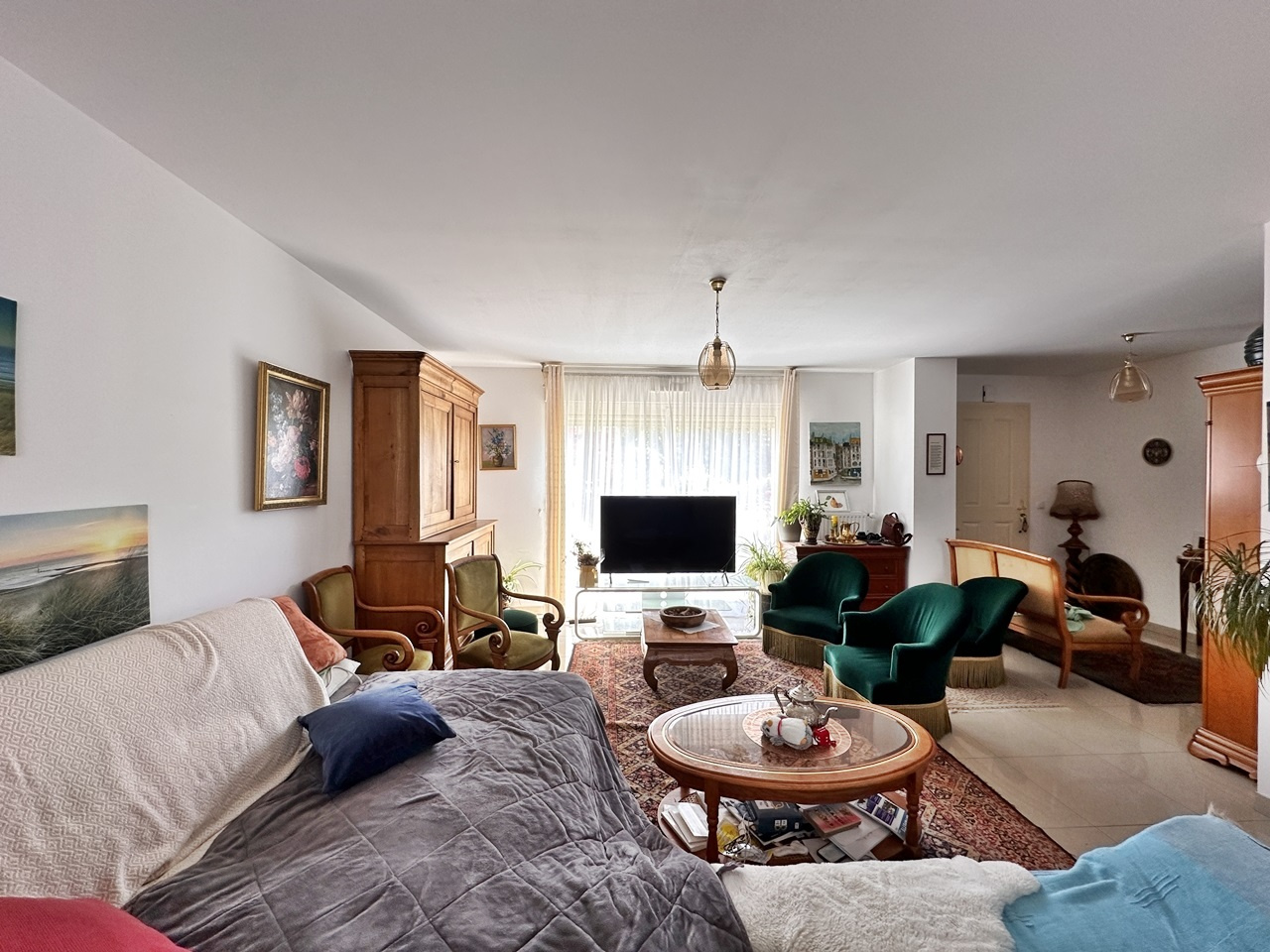 entrée, cuisine aménagée et équipée, séjour 32 m2, couloir, 3 chambres, salle de bains, wc,