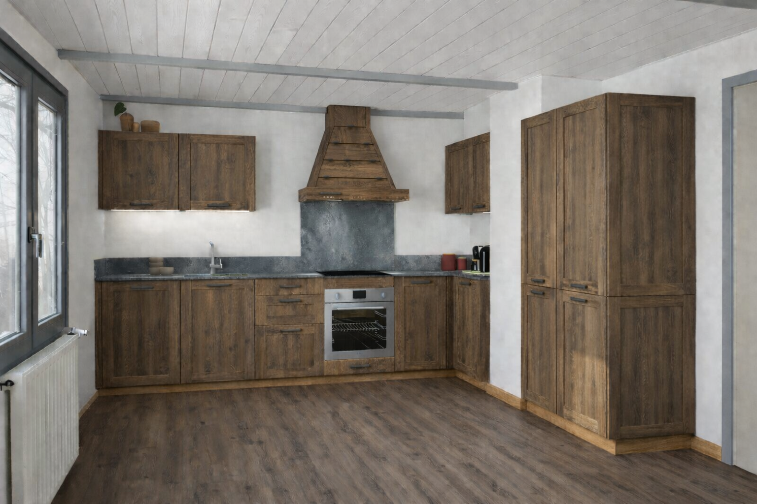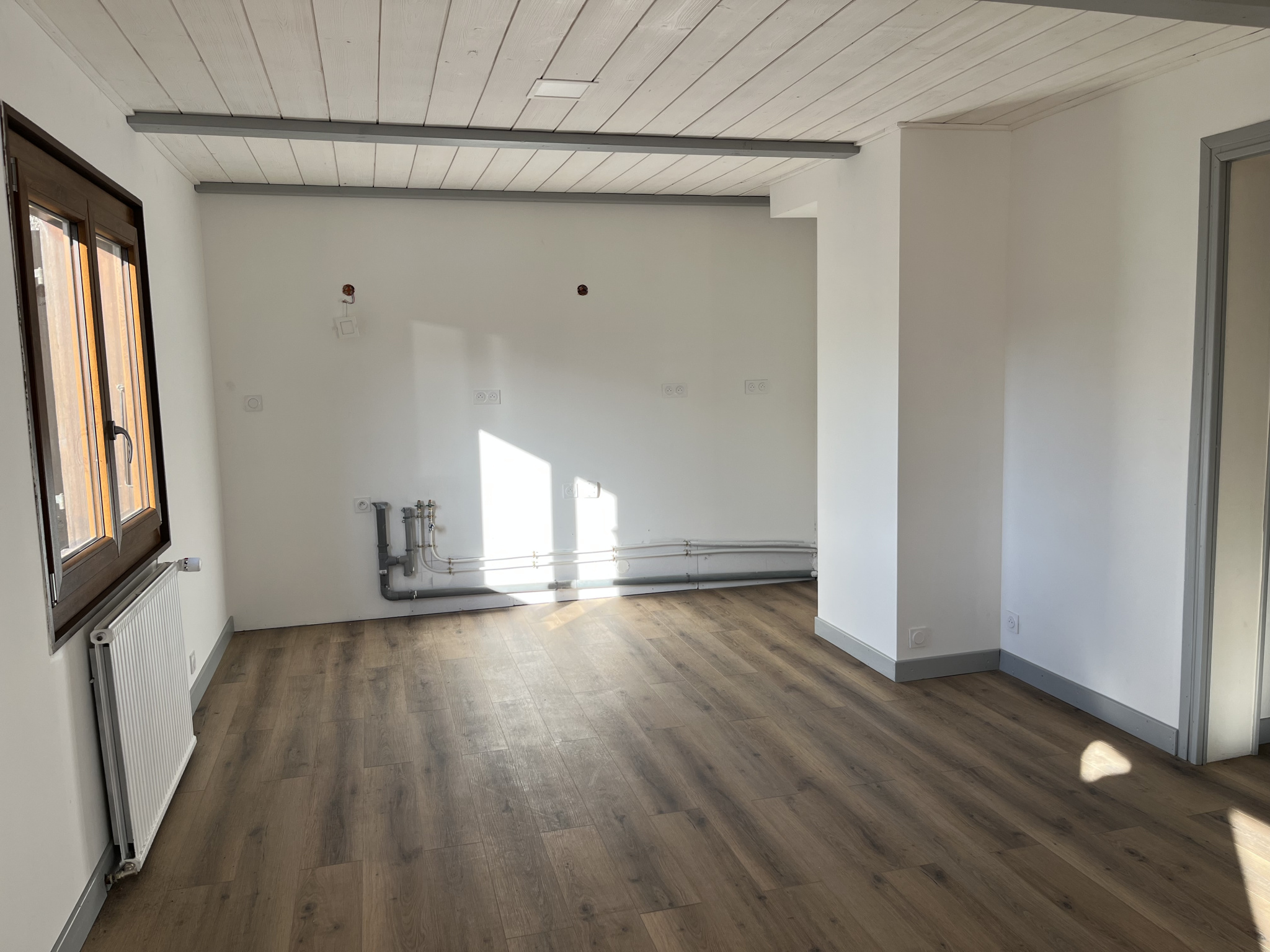 * 1 séjour double exposition Sud/Ouest de 34 m2 avec conduit en attente pour poêle, coin cuisine ouverte à aménager à votre goût et accès à une terrasse plein Sud de 18.50 m2.
