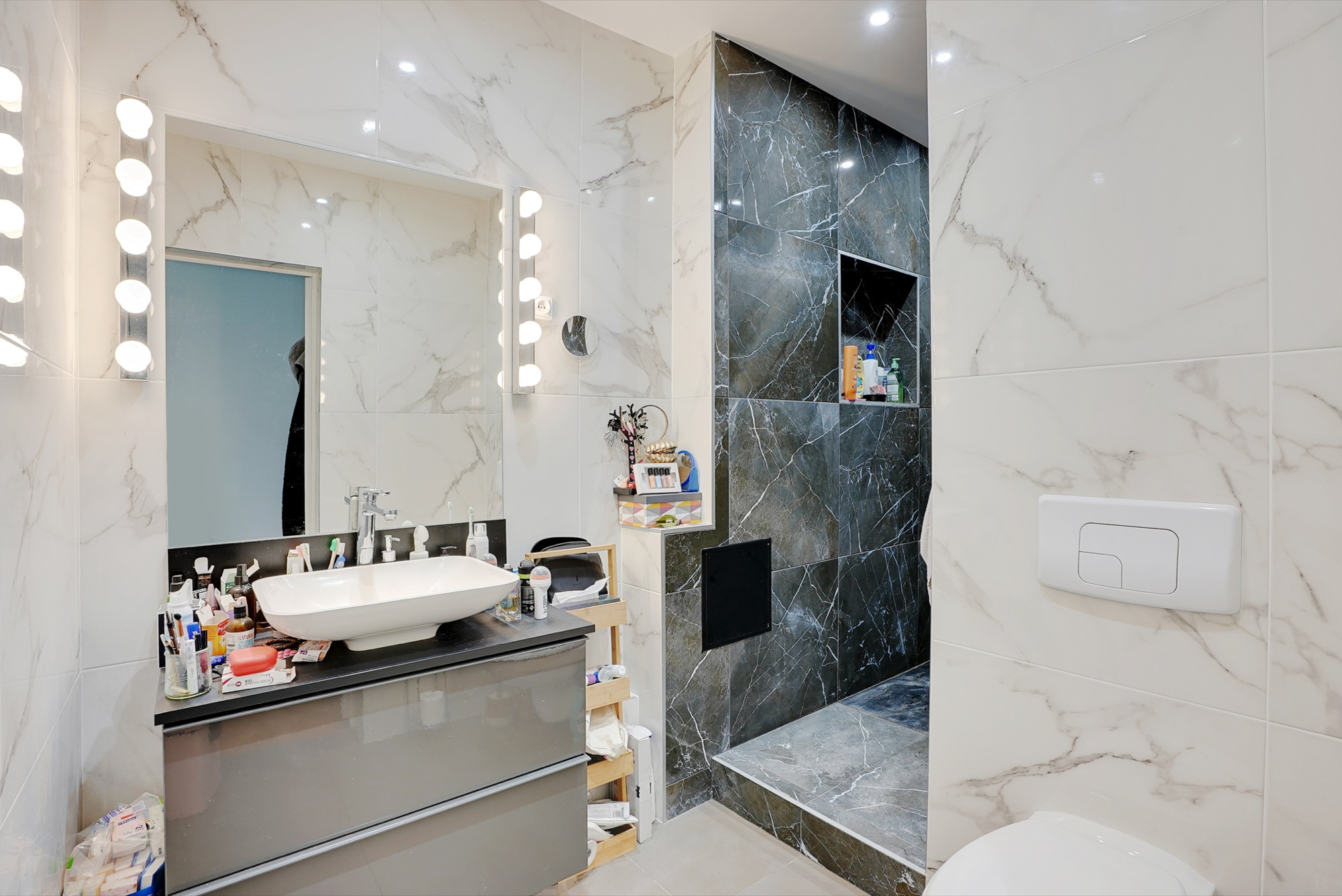 L'appartement exposé sud/est comprend une entrée avec dressing et rangements, une salle d'eau avec douche à l'italienne et WC, une pièce à vivre avec cuisine ouverte donnant sur un balcon, une chambre séparée.