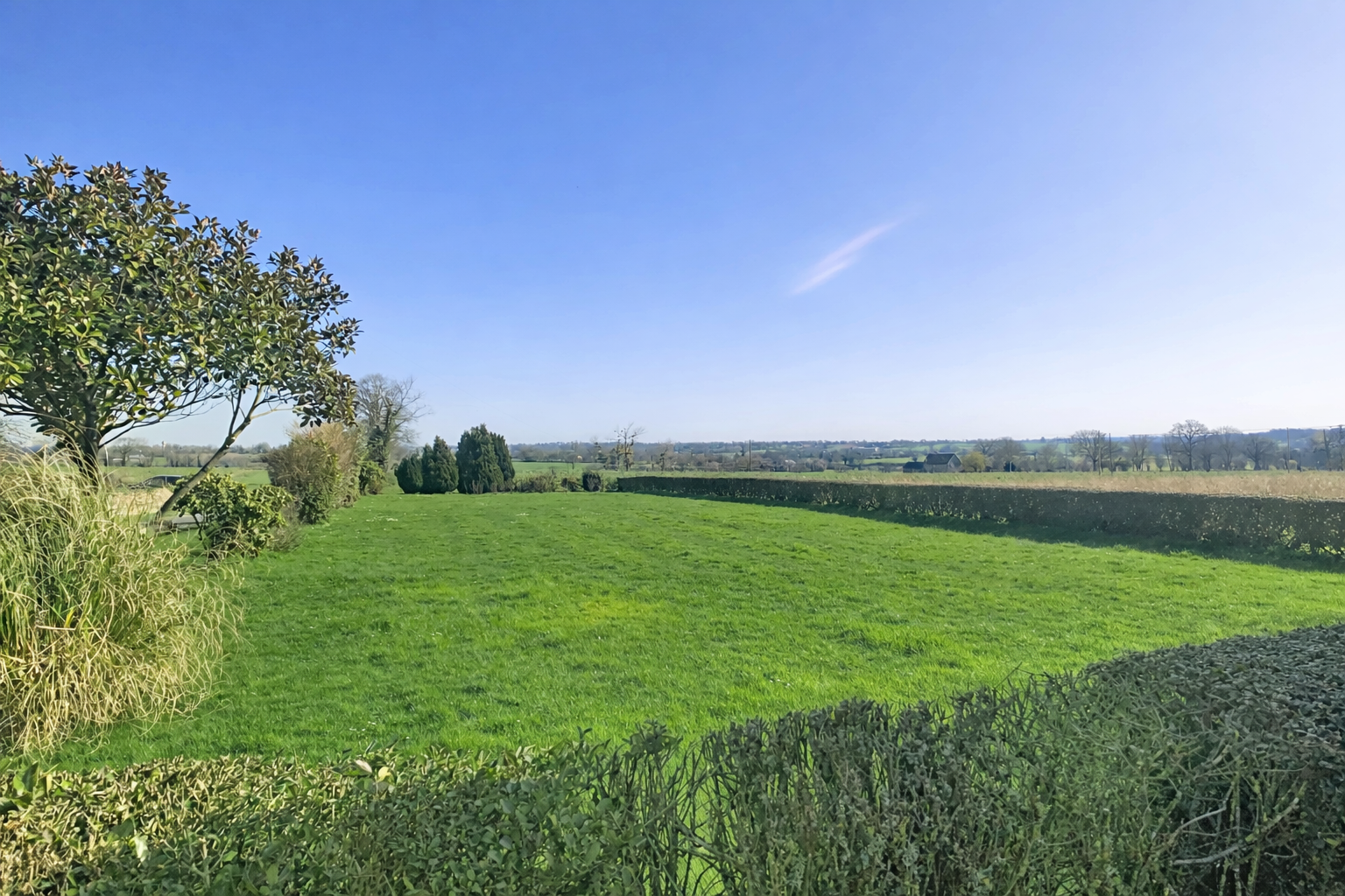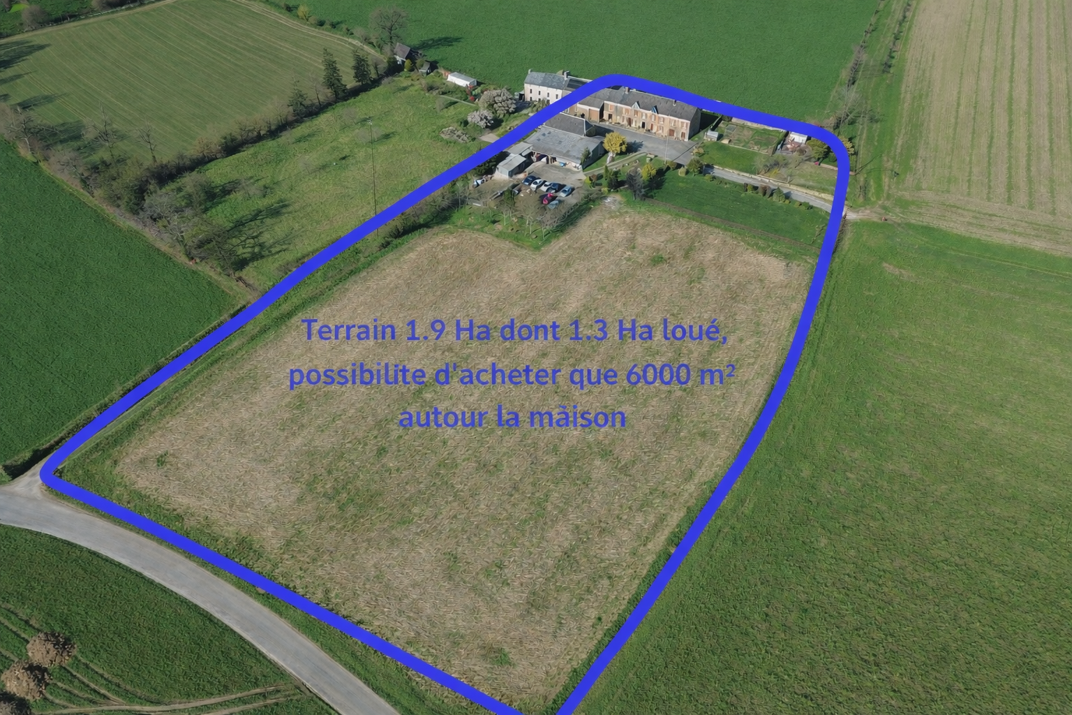 La propriété s'étend sur environ 1,9 hectare de terrain, dont 1,3 hectare actuellement loué, offrant à la fois de l'espace, de la tranquillité et un environnement rural préservé particulièrement apprécié.Il est également possible d'acquérir le bien avec simplement 6000m2 autour de la propriété.