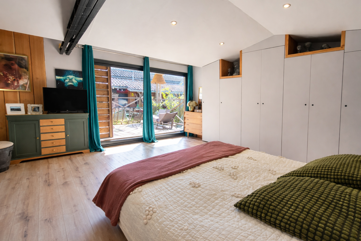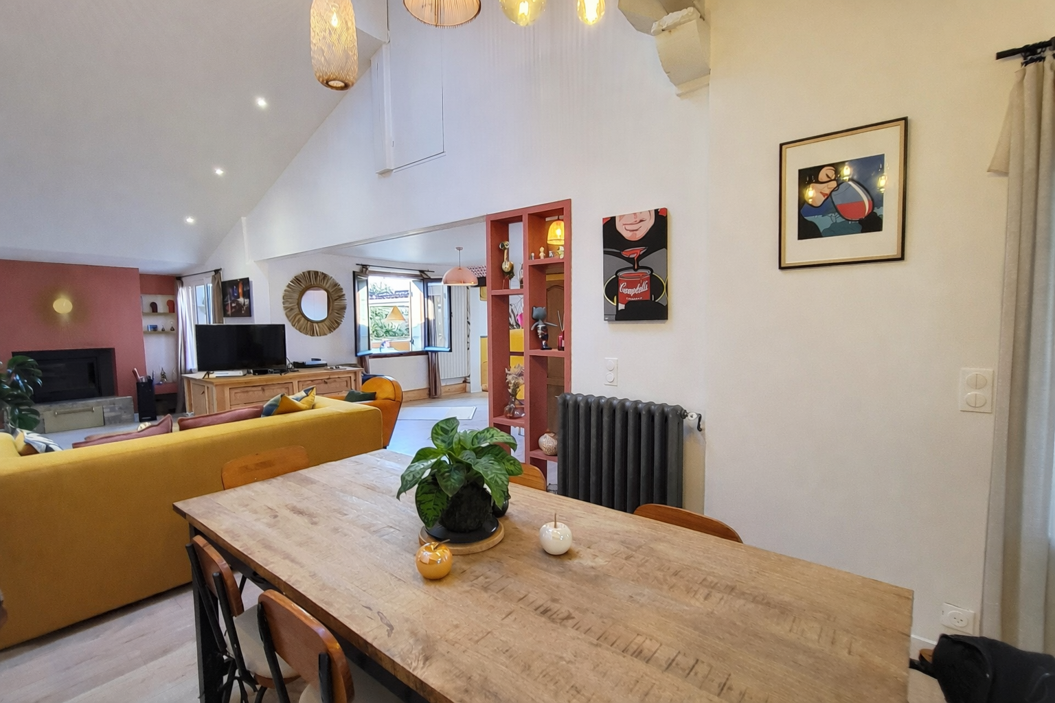 Dès l'entrée, le charme opère immédiatement grâce à une spectaculaire pièce de vie de plus de 64 m2 réunissant salon, salle à manger et cuisine sous un magnifique plafond cathédral. Les volumes, la hauteur et la luminosité créent une atmosphère chaleureuse et conviviale où l'on imagine facilement partager de beaux moments en famille ou entre amis. L'insert bois apporte une touche chaleureuse supplémentaire et de confort tandis que le chauffage central au gaz de ville, assuré par une chaudière récente, garantit un confort optimal.