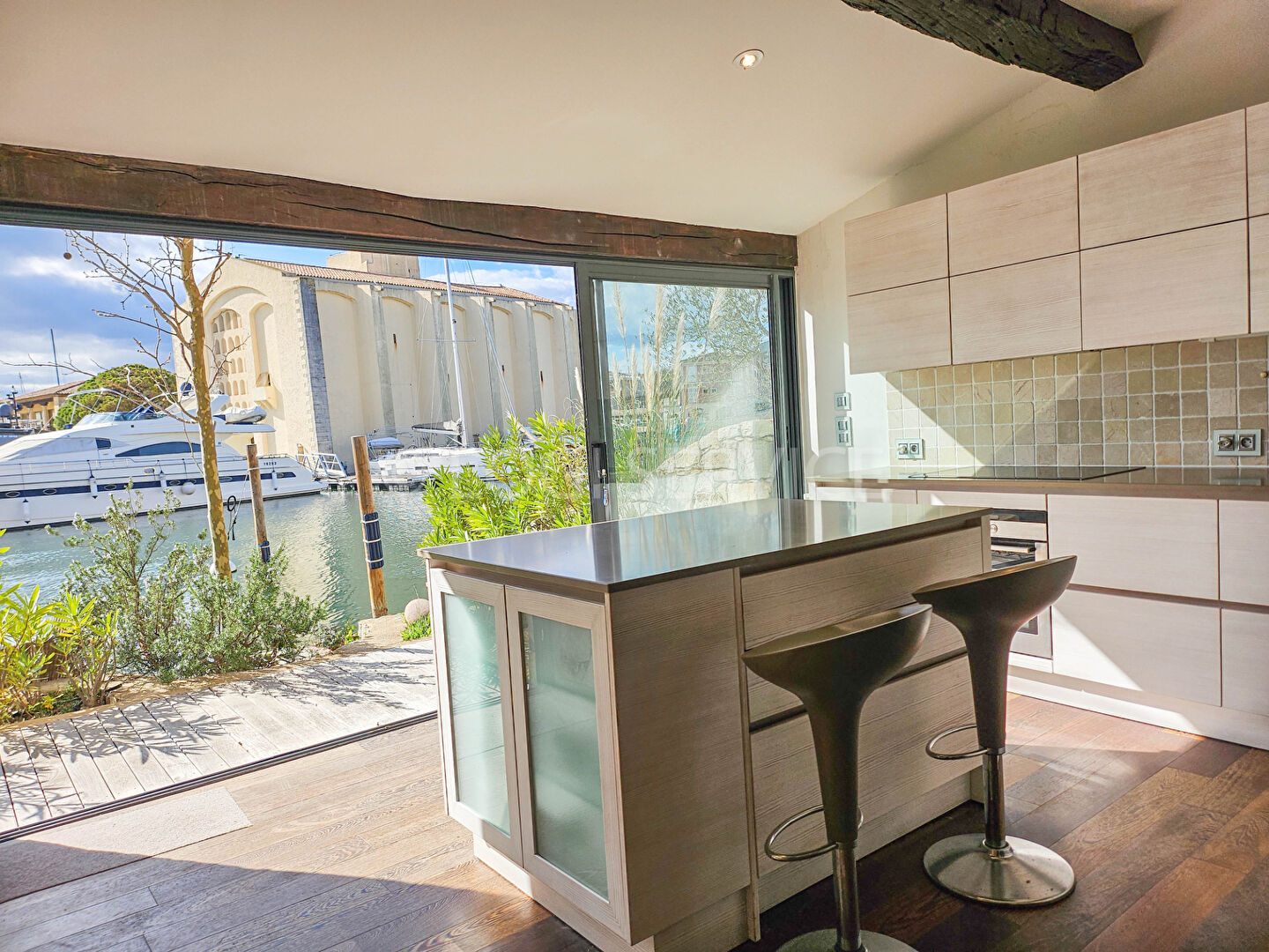 Côté rue, l'entrée se fait par un charmant jardin avec fontaine et un coin repas sous tonnelle. La maison en pierres comprend au rez de chaussée, une entrée une chambre avec sa salle de douches-wc, un wc d'invités, une buanderie, une cuisine équipée avec arrière cuisine , un double séjour avec cheminée, une salle à manger , le tout donnant sur une belle terrasse côté canal. Un amarrage de 12 x 14 mètres avec ponton.