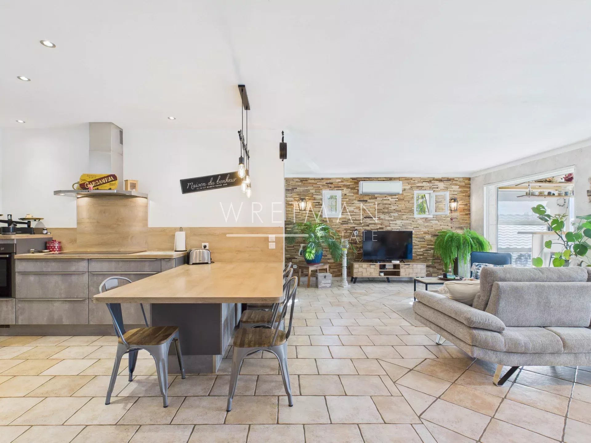 Entrée pratique avec grands placards, vaste séjour convivial avec cuisine ouverte équipée et arrière-cuisine/buanderie, le tout donnant sur une grande véranda isolée et baignée de lumière, parfaite pour recevoir en toute saison.