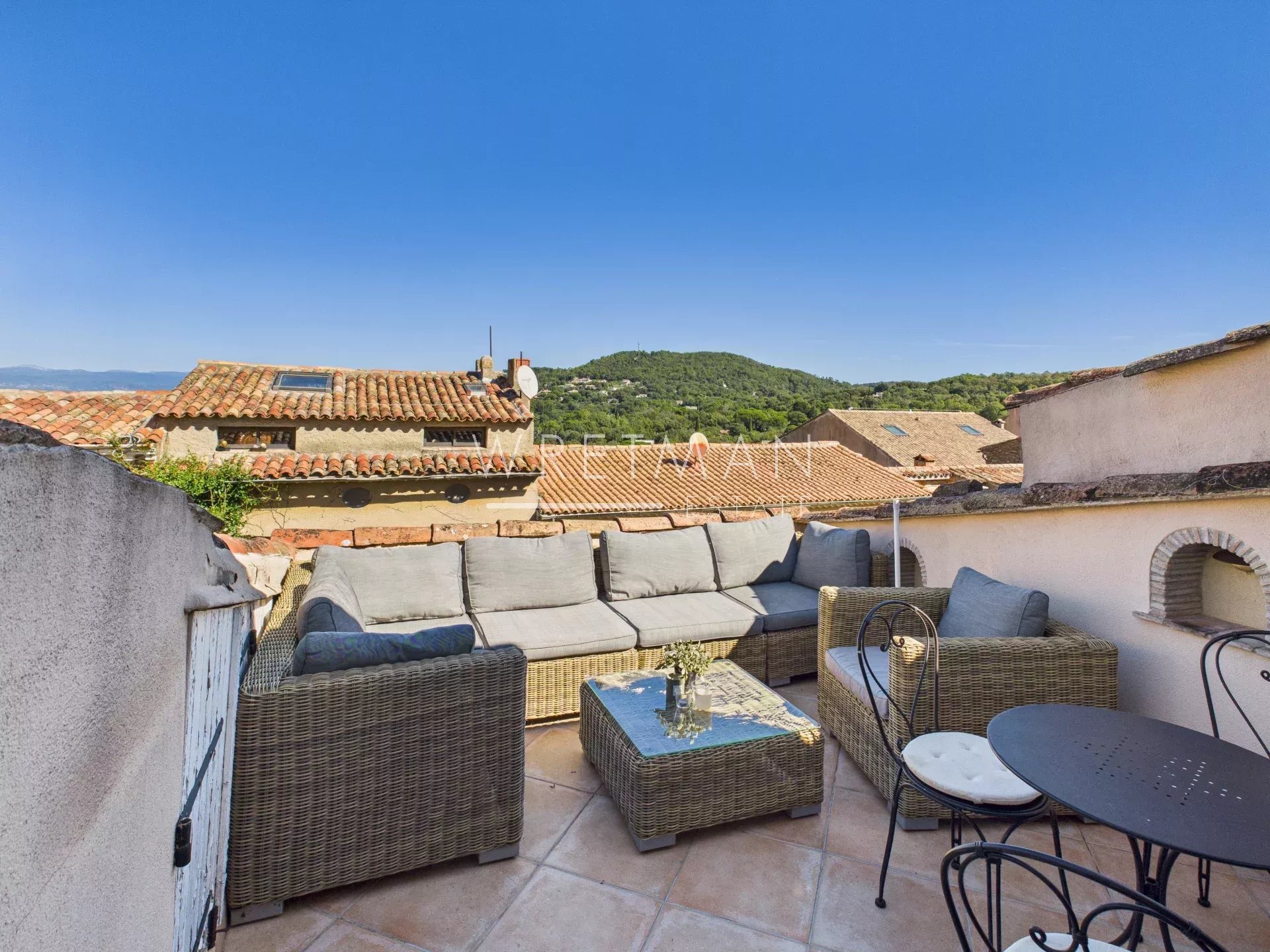 Le dernier étage révèle une charmante véranda avec cuisine, s’ouvrant sur une généreuse terrasse tropézienne — parfaite pour des repas en plein air ou une détente tranquille tout en profitant du magnifique panorama des montagnes des Maures. Une troisième chambre complète ce niveau.