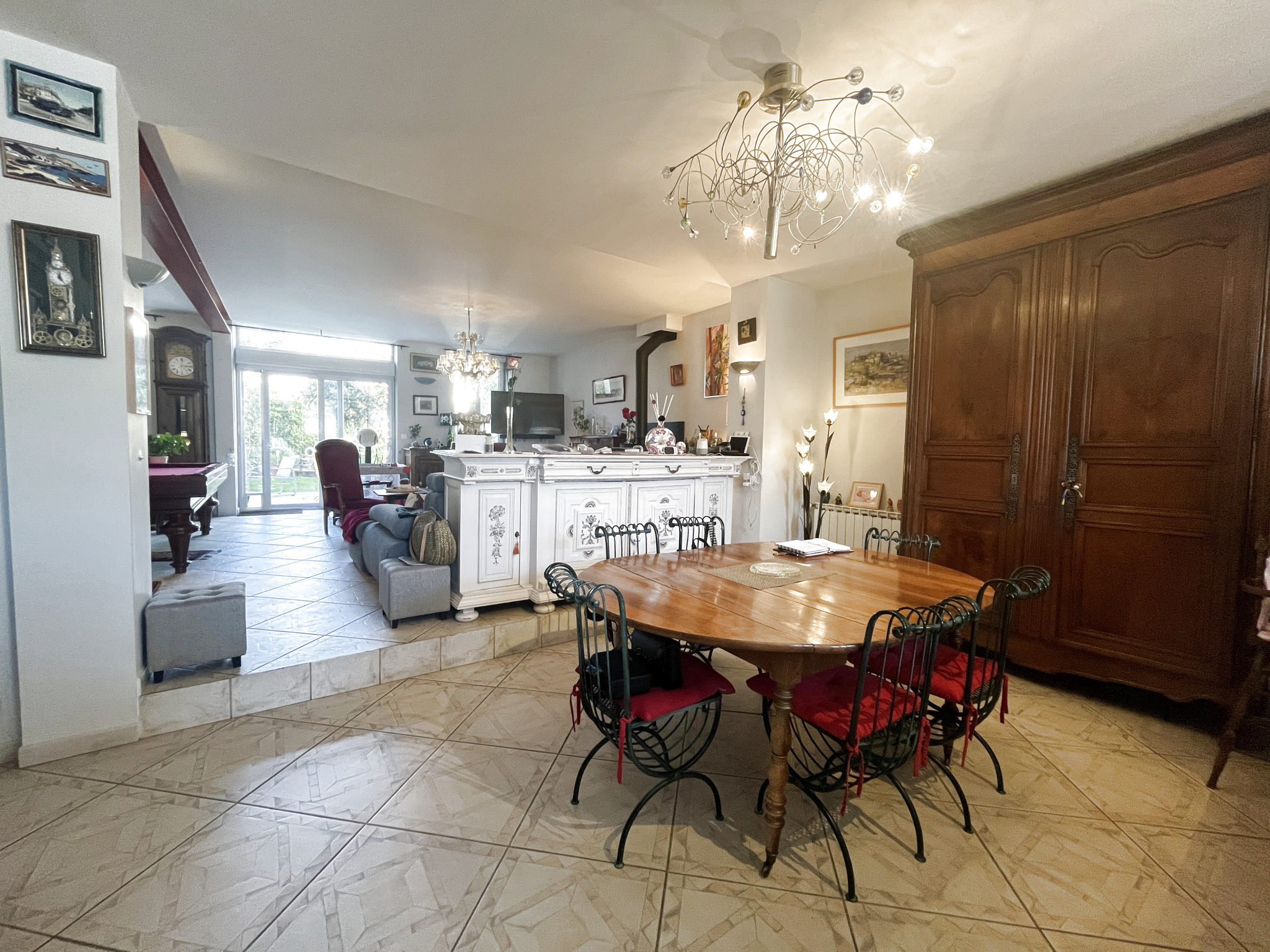 Une cuisine aménagée ouverte sur une vaste pièce de vie d'environ 57 m2 donnant accès au jardin,