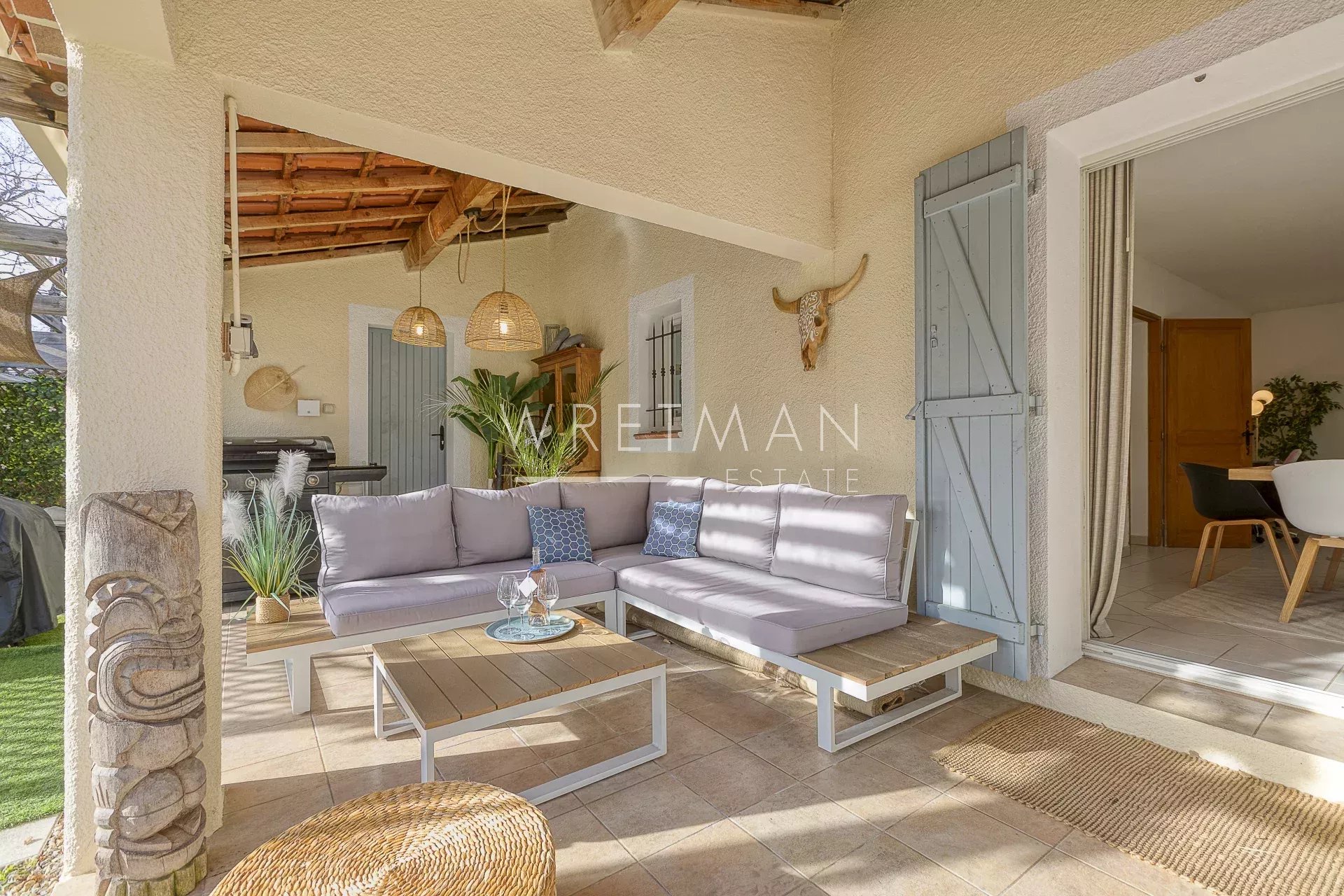 La villa principale dispose d'un salon spacieux et lumineux de 58 m² avec de grandes portes coulissantes donnant sur la terrasse partiellement couverte.