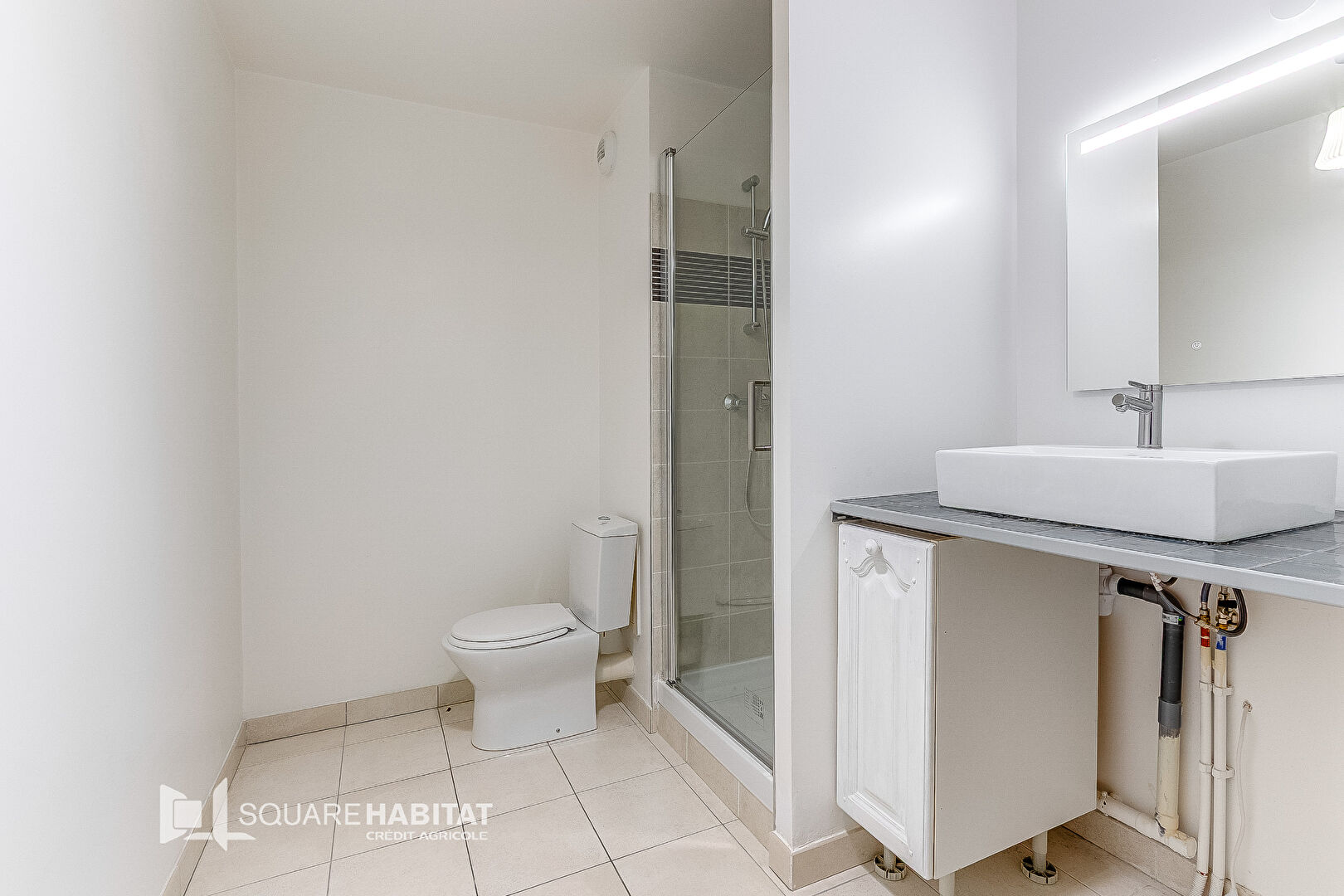 Appartement de type 2 situé dans une résidence récente, offrant une pièce de vie avec cuisine équipée, salle de bains (douche, vasque, WC), chambre.
