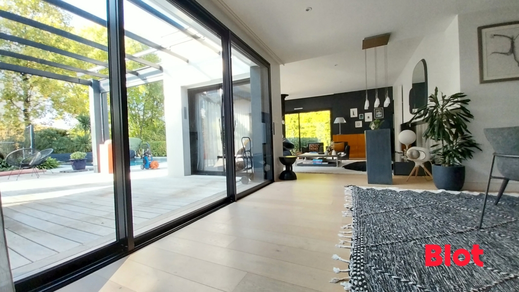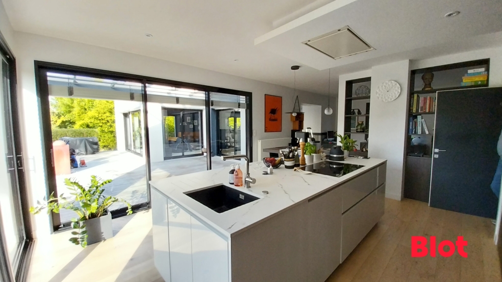 BLOT IMMOBILIER SAINT GREGOIRE - A vendre sur la commune de SAINT GREGOIRE, magnifique maison d'architecte rénovée en 2017 d'une surface habitable de 230 m², construite sur sous sol et comprenant au rez-de-chaussée une pièce de vie lumineuse de 60 m², une cuisine aménagée et équipée, une arrière cuisine, une suite parentale (chambre avec dressing et salle d'eau). L'étage se compose de quatre chambres, une salle de bains avec douche. Terrain arboré et paysager d'environ 2300 m², avec piscine chauffée.