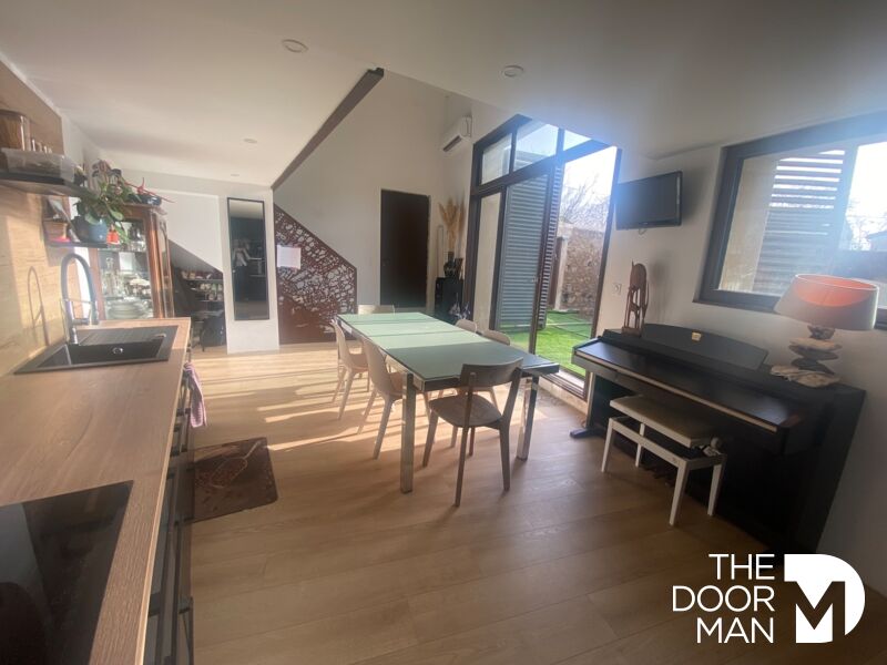 Une entrée élégante, soulignée par une porte en fer forgé, ouvre sur une vaste cuisine de 27 m², entièrement aménagée et équipée.
