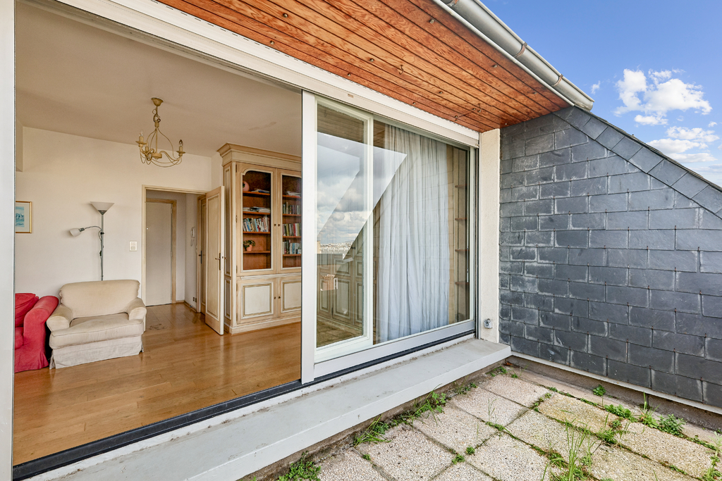 Au dernier étage d'un immeuble bien entretenu construit en 1978, ce studio plein de potentiel offre une surface au sol de 41m² (32,41m² Carrez).