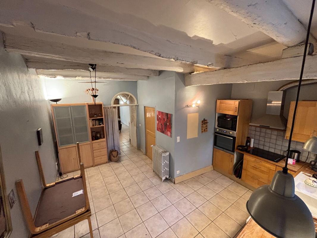La maison s'ouvre sur un séjour voûté plein de caractère, agrémenté d'une cheminée ancienne, ainsi que sur une cuisine dinatoire avec accès direct au jardin, permettant de profiter pleinement des extérieurs.