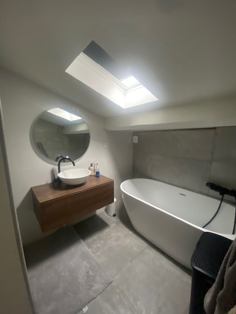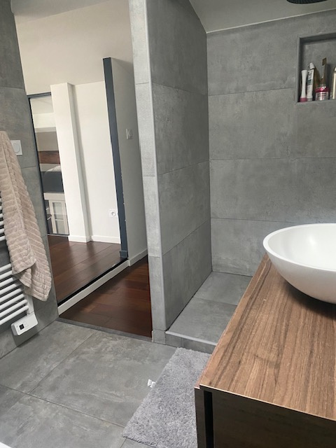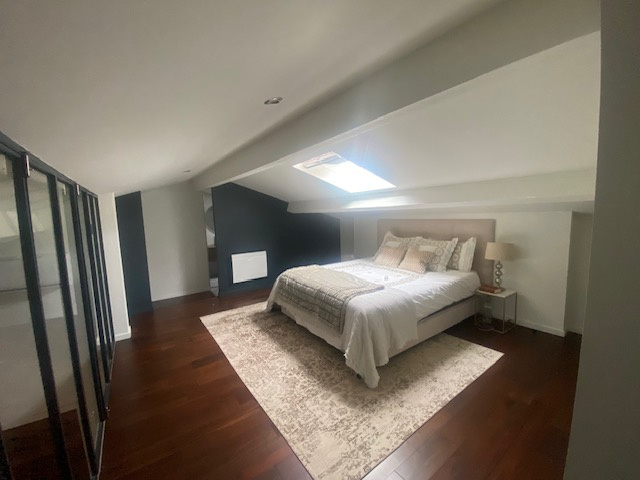 Dans la partie duplex, une belle suite parentale de 18,96m2 au sol vous attend avec sa salle de bain (baignoire et douche italienne), un WC et un vaste débarras.