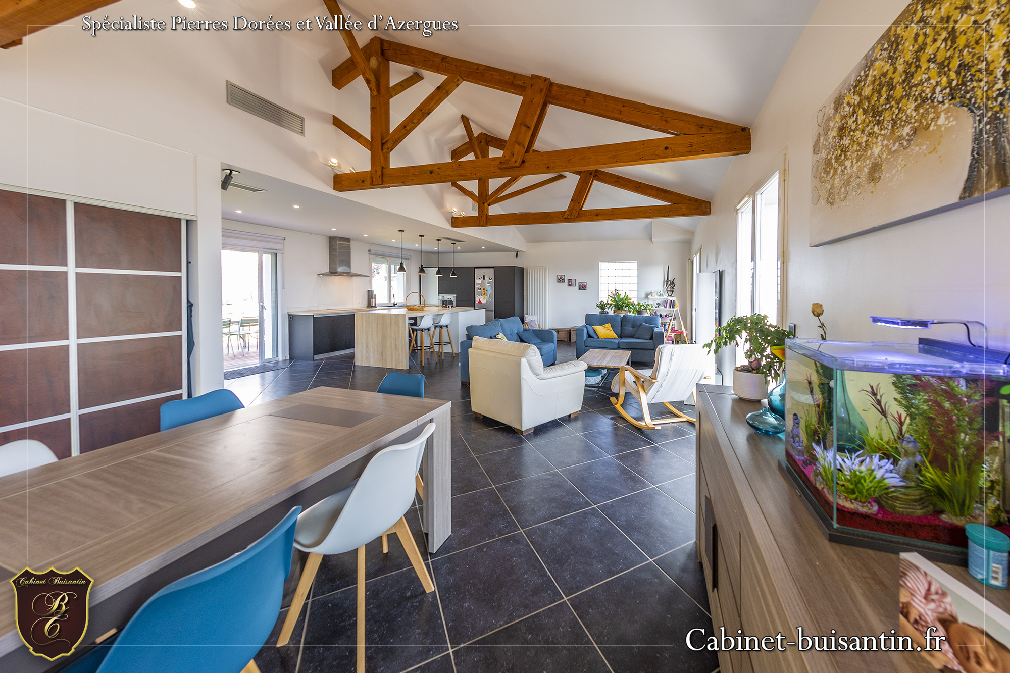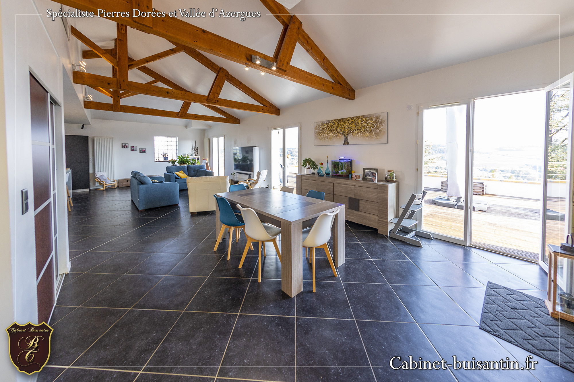 EXCLUSIVITE - A 7 minutes de Lozanne - En position dominante sur le village de Chessy, Villa de standing revisitée par architecte en 2003 de 185 m2 habitables comprenant : Vaste pièce à vivre de 81 m2 avec plafond rampant et fermes de charpente apparentes, ouvrant sur terrasse de 85 m2 avec vue imprenable à 180o, cuisine équipée, 3 chambres avec salles d'eau privatives (dont 1 suite parentale), plus bureau. Sous-sol avec garage double, atelier, cave et buanderie. Terrain clos et paysagé de 2 135 m2 avec piscine au sel chauffée et cabanon de jardin.
