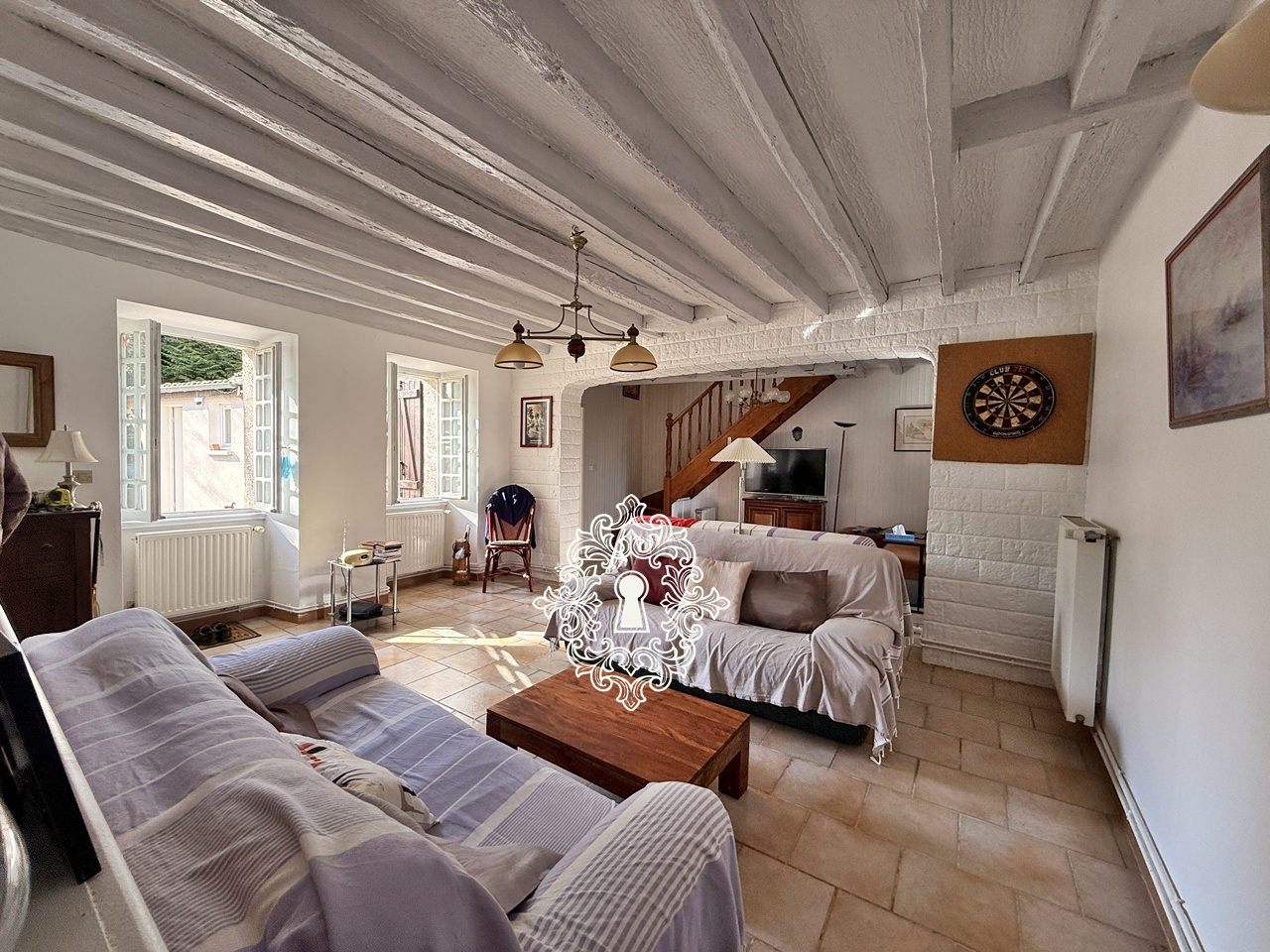 séjour 54 m2 (cheminée avec insert), cuisine aménagée et équipée, chambre, salle de bains, wc,