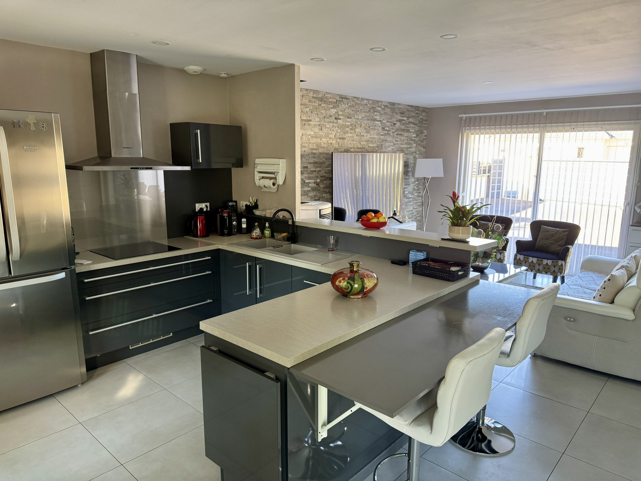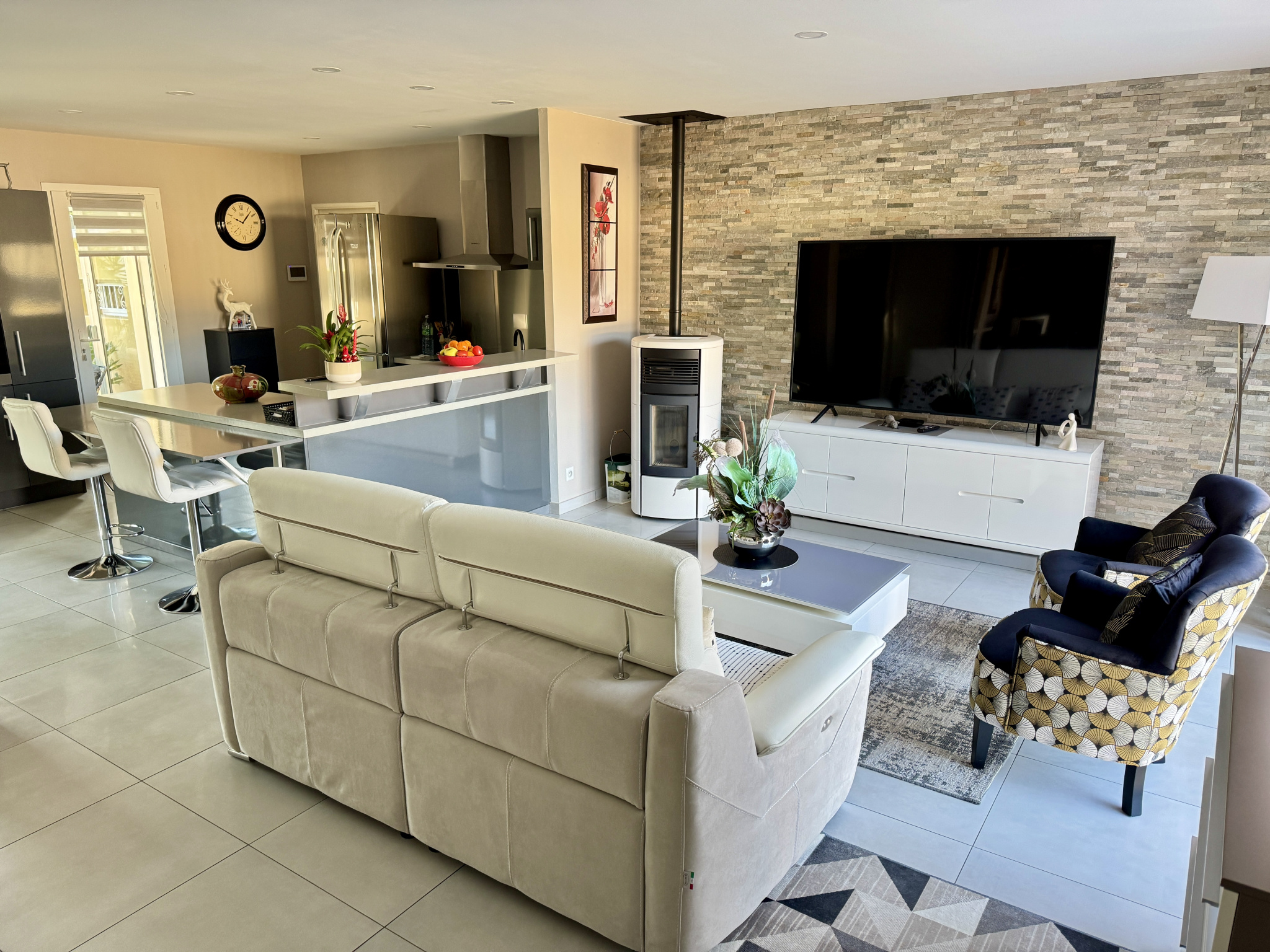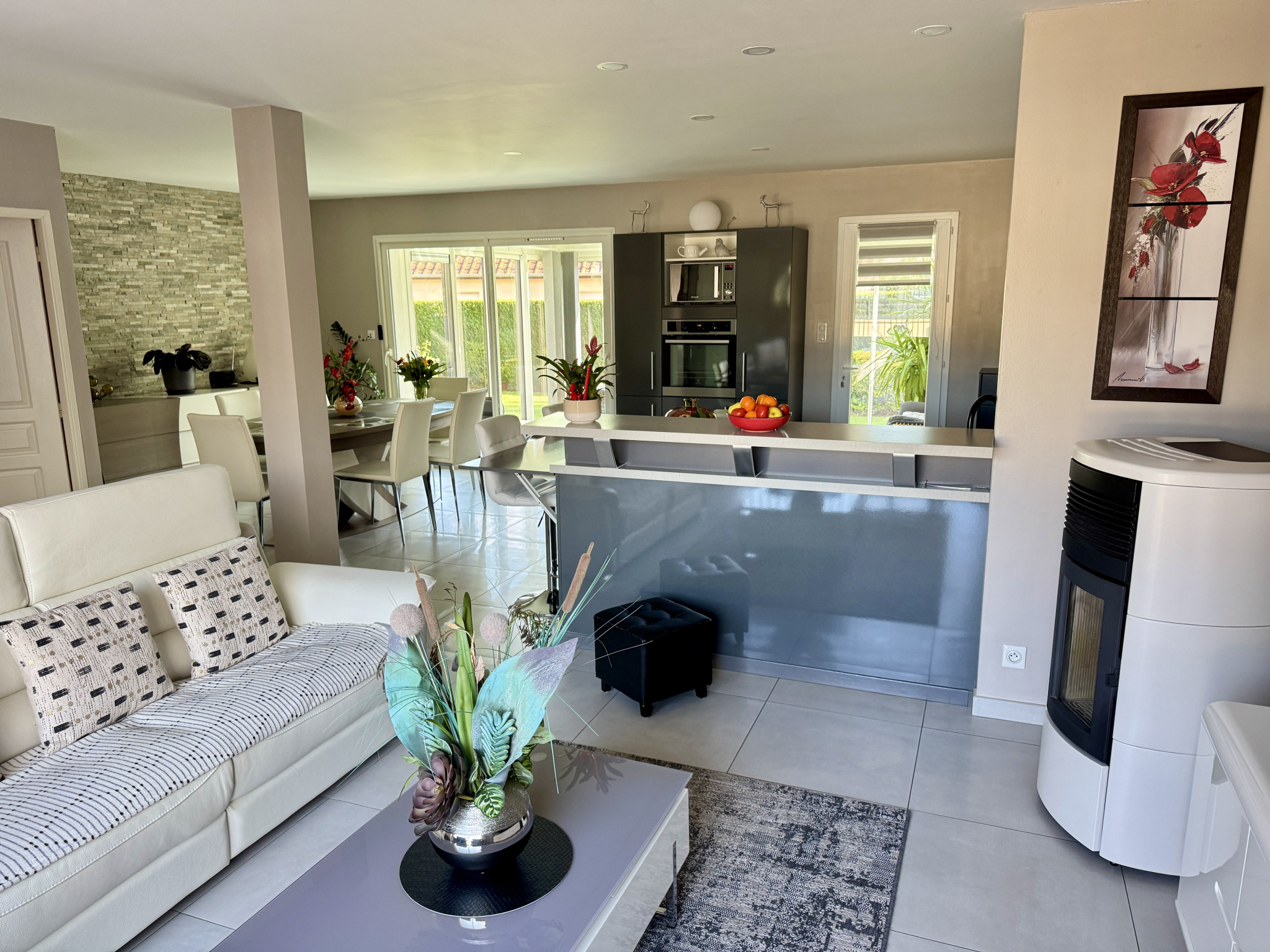 Dès l'entrée, vous serez séduits par une grande pièce de vie lumineuse d'environ 50 m2 avec cuisine ouverte aménagée et équipée. Un poêle à granulés vient compléter cet espace chaleureux.