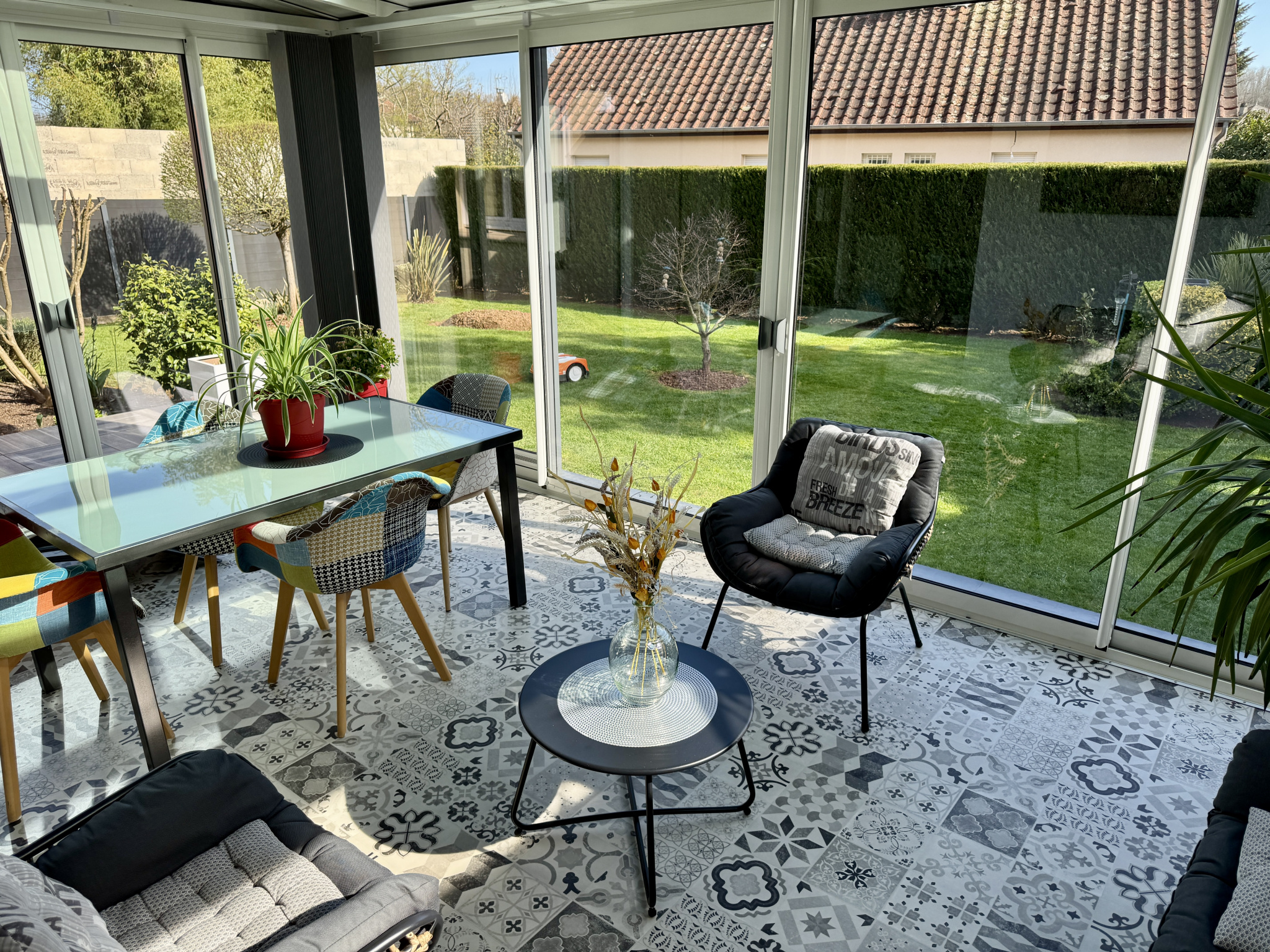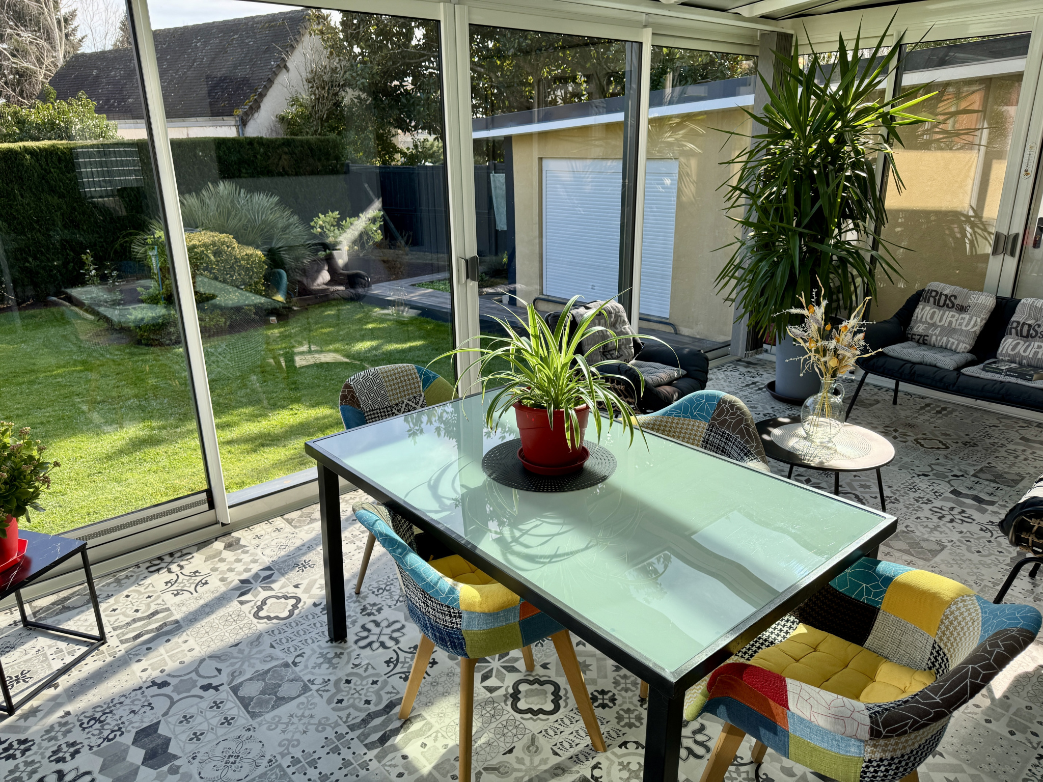 La pièce de vie s'ouvre sur une belle véranda chauffée de 19 m2, véritable pièce supplémentaire permettant de profiter du jardin en toute saison.