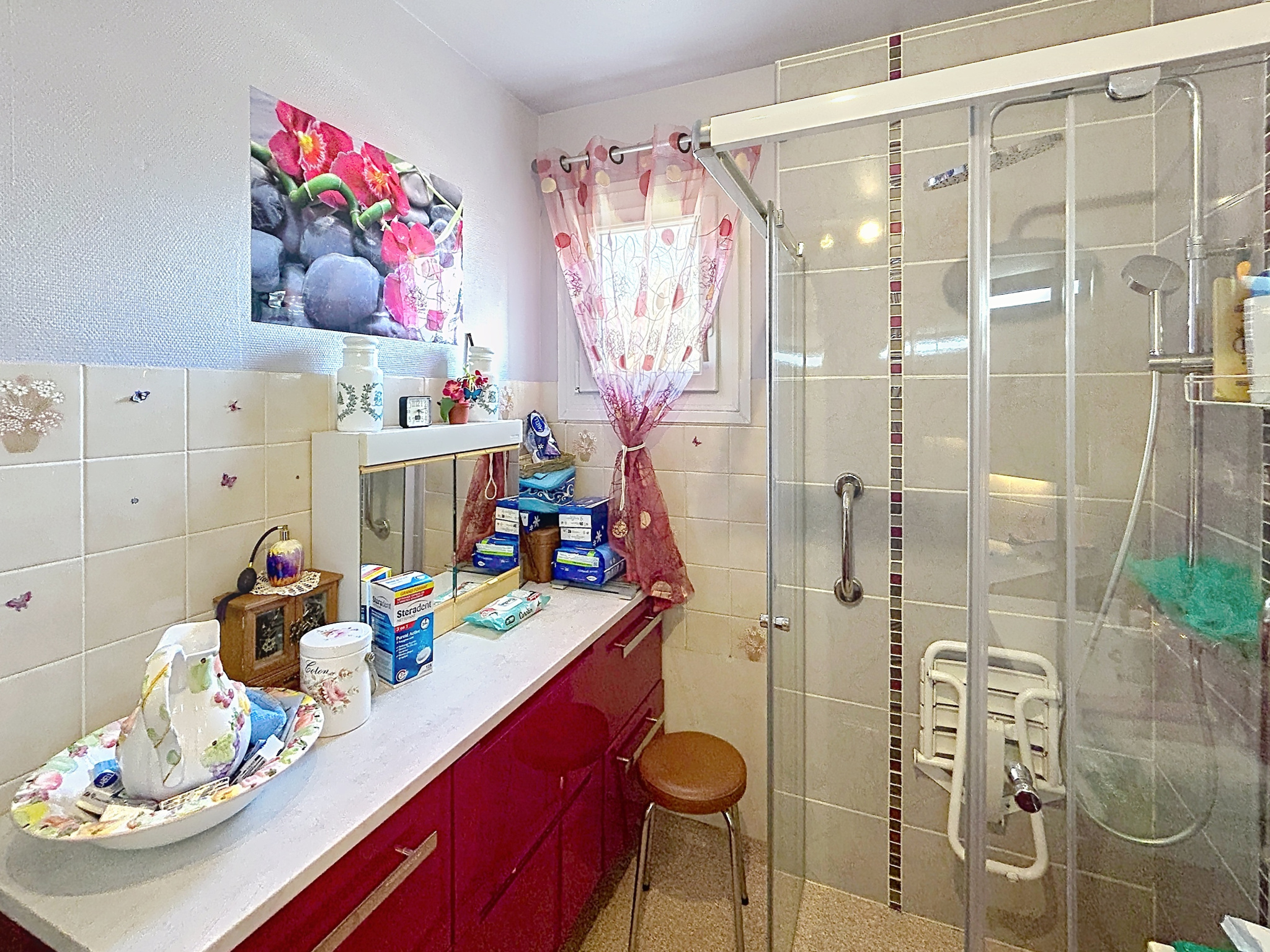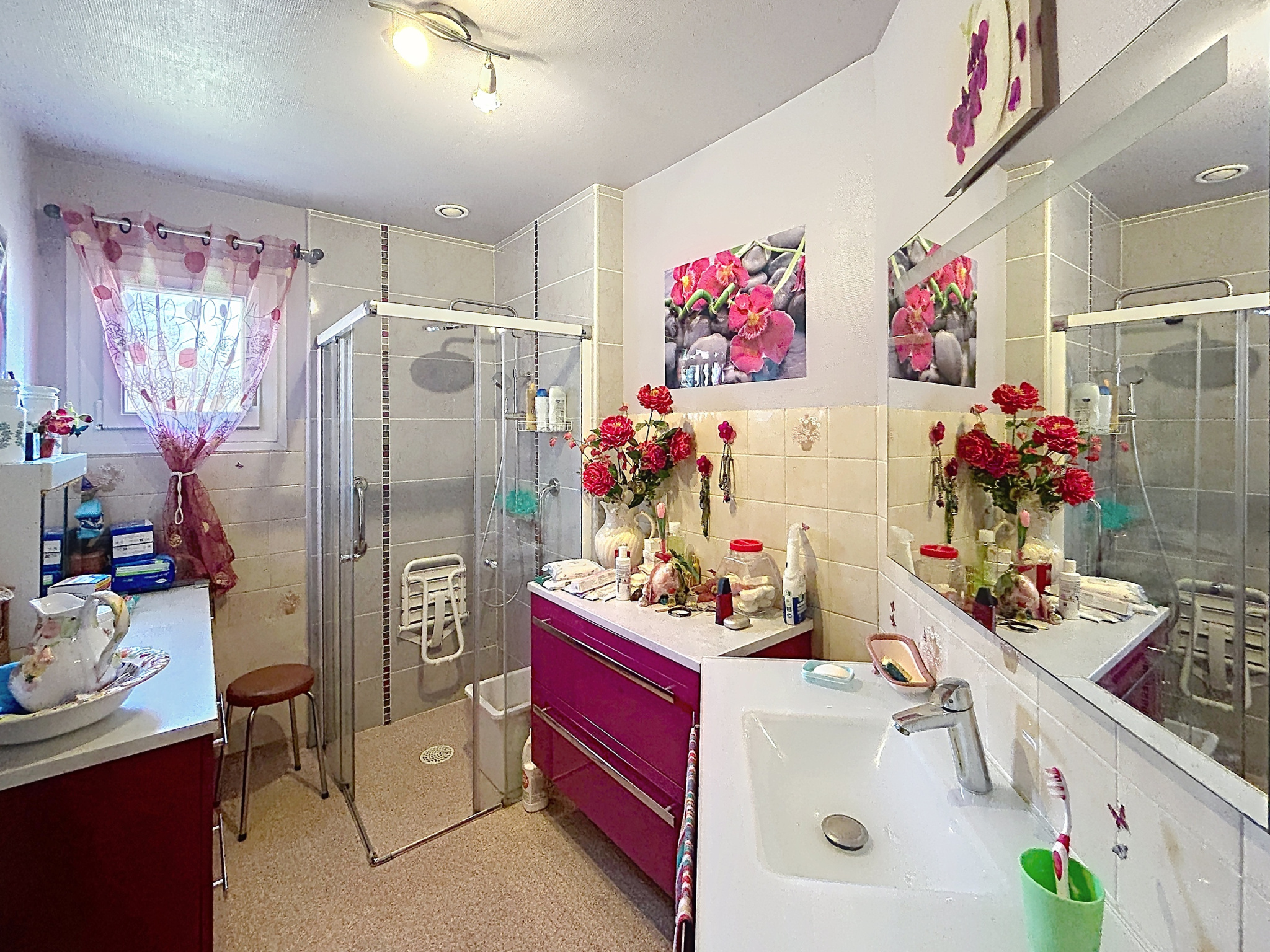 - Salle d'eau, sol revêtement plastique antidérapant, 5 m2, avec meuble vasque et douche, meubles de rangement, sèche-serviette électrique.