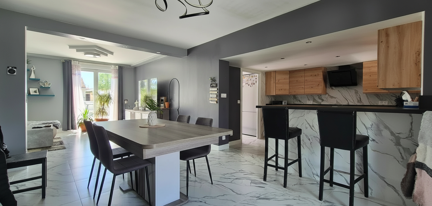 Dès l'entrée (9,75 m²), vous accédez à un séjour lumineux de 25,52 m², ouvert sur une cuisine équipée avec îlot central de 20,86 m². Un espace convivial, pensé pour partager les moments du quotidien.