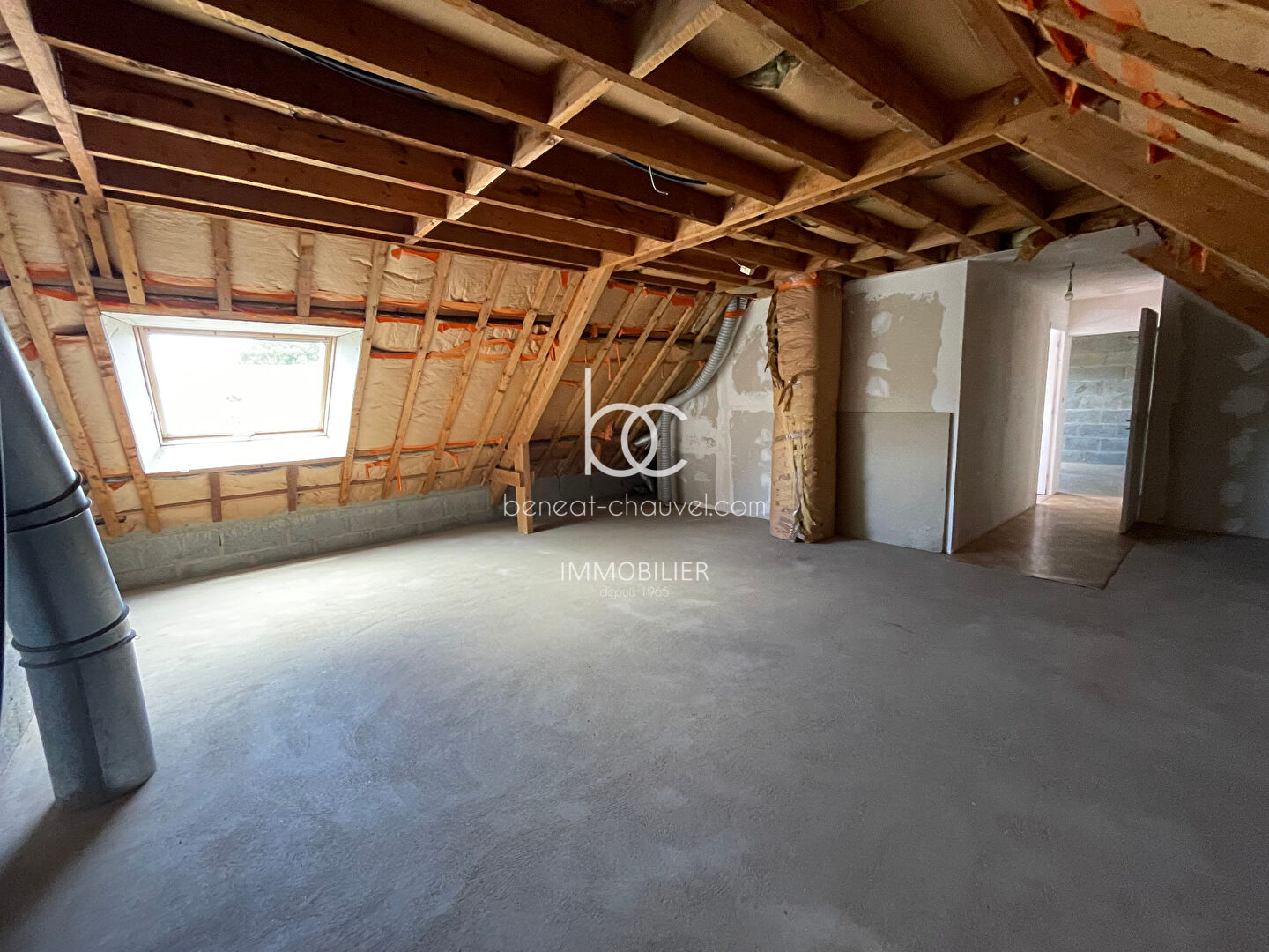 L'accès par le garage mène à l'étage déjà en partie aménagé avec une chambre et un W.C. avec lave-mains. Possibilité d'aménager facilement deux autres chambres et une salle de bains supplémentaire, portant le potentiel habitable total à environ 130 m².