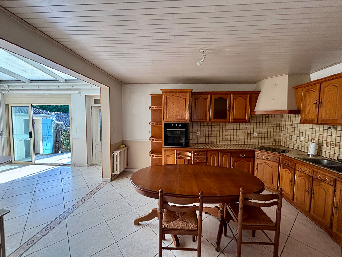 La maison principale propose, au rez-de-chaussée, une entrée, un salon-séjour, une cuisine ouverte aménagée et équipée, des WC, un débarras, ainsi qu'une véranda lumineuse et une terrasse venant prolonger les espaces de vie et offrant un cadre agréable pour profiter des beaux jours.